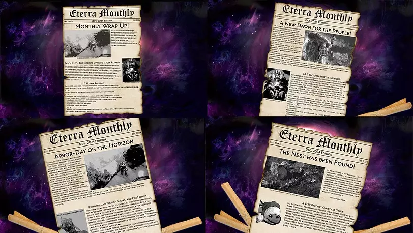 Content UpdatesCampaign Added return portals in The Garden to take you back to the scene that you had portaled from. Updated quests pop-up after chapter 9 and 10 to show after loading the following scene so it's more visible that you got the reward for completing the quest. Random Encounters Added a chat message notifying players who entered the zone if there's a Mysterious or Torn Rift nearby. All Primordial Uniques that could previously only be purchased can now also drop from Rift Beasts. This chance scales with the number of active Evolutions, and scales slightly with the number of materials that the Rift Beast would drop that are also in the Unique's vendor cost. It's also increased by Corruption and the Circle of Fortune rank bonus which increases the chance for bosses to drop their specific rewards. Class & Skill UpdatesPrimalist Summon Scorpion: Avalanche boulders created by the Reverberating Strike node can now trigger Avalanche's Crater and Rockfall nodes. When cast this way, Earthquake and Upheaval use the Scorpions' stats, but the player's Earthquake and Upheaval trees. Unique & Set Item UpdatesUnique Item Changes Evolution's End now displays the evolutions of the Rift Beast it summons. Descriptions of the Evolutions can be viewed when showing mod explanations (alt). Quality of Life & Other ChangesQuality of Life Added a Return To Title button to give the player the ability to return to the login screen from character creation/selection. Primordial Feathers, Fangs, Petals, and Horns should now properly display their rarity visuals on the ground and on the minimap. Crystallized hearts should now properly display their rarity visuals on the ground and on the minimap. Temporal Keystones should now properly display their rarity visuals on the ground and on the minimap. Merchant Tokens and Black Market Tokens should now properly display their rarity visuals on the ground and on the minimap. Added unique sound to Merchant's Guild and Black Market token drops. Switching the monitor the game client is running on now updates the screen resolution option in-game to match the new monitor. General UI Updated the order Primordial Materials display on item tooltips and in Skarven Bloodthorn's shop to match the ordering from the Keys tab of the inventory. Performance Optimized foliage spawning areas and reduced polycount in some scenes to improve GPU performance. Made some optimization improvements to the following enemies: Draal Queen Large Temple Construct Marble Guardian Chosen Erased Rewoven Soulless Husk Visual & Sound ChangesSkills Fire Aura now adds visual effects on enemies it is affecting. Enemies & NPCs Adjusted sounds for Gorilla enemies and the Gorilla Bone Golem cosmetic. Polished Skarven Bloodthorn's animations. Other When being damaged while in a full-screen menu there is now an audio cue to go along with the red visual indicator. There are now dedicated sounds for when the player enters and exits Mysterious and Torn Rifts. Bug FixesSkills & Passives Fixed an issue where Totems would not target spires in Online Mode. Fixed an issue where hit flash visuals remained on minions after transition. Ring of Shields: Fixed an issue with Ring of Shields consuming more charges than required on transitions. Shift: Fixed an issue causing the Through the Shadows node to fail to return the player when the created Shadow was consumed. Dancing Strikes: Fixed an issue where Tenacious Vitae was applying a more damage over time taken modifier instead of a less damage over time taken modifier. Aura of Decay: Fixed an issue where modifying the area of an active Aura of Decay, such as with Flay's Open Wounds node, while the aura was attached to another enemy, such as with Flay's Transference node, would sometimes cause the Aura to visually have a different size from its actual area of effect. Assemble Abomination: Fixed an issue where the Devouring Souls ability, acquired from the Corrupt Palate node, would visually travel upwards when they would expire, instead of disappearing immediately. Swipe: Fixed an issue where the Primal Resonance node would have no effect if the closest companion's ability was not equipped on the player's action bar, such as the additional Wolf provided by the Permanent Bond node. Items Fixed an issue where the guaranteed Shrine Boots from the Chronomancer's Supplies cache had three non-sealed suffixes. The increased cooldown recovery speed affix is now sealed like it was prior to 1.3. This does not affect items that have already dropped. Fixed an issue where "on kill" effects were not triggered by Thicket of Blinding Light or Scournful Blood. Fixed an issue where Tier 2 of The Invoker's Scorching Grasp Reforged Prefix shard did not have its Ignite on Hit properly capped at 10%. Campaign Fixed an issue where a visual distortion would sometimes pass by in the Garden. Fixed an issue where flower and mushroom objects introduced in chapter 10 would block projectiles. Fixed an issue in the Last Refuge Outskirts preventing navigation of some stairs. Monolith Fixed an issue where killing Liath with certain types of damage would cause the Farsight Turtle woven echo to enter a state where you could not progress. Fixed projectiles being destroyed around crafting objects in woven echoes, such as Oerden's Watch. Fixed an issue where basic Arena echoes could spawn multiple champion enemies in the final wave. Dungeon Fixed an issue where spending a key to respawn in an Offline Dungeon would bring the player to their last visited town instead of respawning them in the active dungeon run. Arena Fixed an issue where arena portals were not affected by equipped portal cosmetics. Fixed an issue where arena portals spawned on your mouse cursor instead of in front of you. Fixed an issue where arena portals didn't play their spawn animation. Random Encounters Fixed an issue where Skarven Bloodhunter would sometimes not follow you into caves. Fixed an issue where a bone in the starting area of c