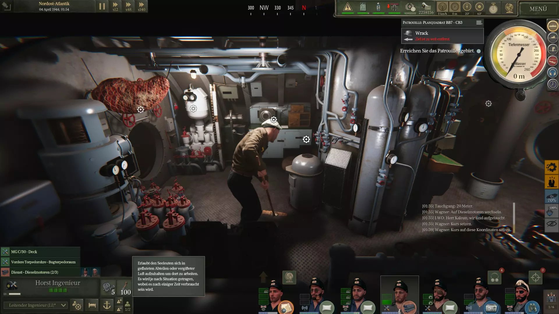 如何尽可能快速下潜? 准备工作 一场新的敌袭即将到来。在抵达任务目标之前,你还有很长的路要走。所以要做好万全准备。 突然出现的飞机或发现敌舰……该怎么办? 为了尽可能快速发现飞机和舰船,你应该始终在舰桥上安排一名军官。他还应始终有2人协助。 研究你的雷达并安排人员操作。 发现敌人越早,你就有越多时间做出反应。 混乱爆发 你正以时间加速相对从容地在海上航行。 突然有人大喊“警报”。 尽快按下空格键暂停游戏,先深呼吸。快速查看地图后,便能发现警报的原因。潜艇最重要的武器和防御手段便是隐蔽性。一旦发现敌情,迅速下潜永远是正确的选择。 那么,如何让潜艇快速下潜呢? 1. 按下深度计旁的“最大安全深度”按钮。 2. 让离阀门最近的军官(通常是地图旁的导航员)手动注水压载舱。务必手动操作,游戏自动选择的军官往往距离更远。 3. 向舰桥上的军官下达占领观察潜望镜的命令。这样他和船员就能更快回到舱内。 4. 立即切换至电动机。由于李(LI)可能还在处理柴油机,刚开始前往电机处,所以暂时无法启动AK(全速前进)。请记住这一点。务必确保有一名机械师前往电机处,并配备2名助手,以便尽快启动AK。 我们为什么要这么做?如果游戏后期自动切换到电动机,你们的船只会大幅减速。我们要避免这种情况。 5. 遭遇空袭时,立即将方向舵打到最大左满舵或右满舵。我们可不想成为容易被击中的目标。 6. 现在恢复正常游戏速度。注意观察速度表。一旦条件允许,立即切换到AK。 看着你们的船在波浪中沉没吧。其他事项 若你发现水平线上有烟雾,并想用潜望镜侦察船只,潜水后让潜艇下潜至约40至50米深度。让轮机长负责深度控制,将航速调至慢速,然后从下方缓慢调整潜望镜深度。 即使在非紧急情况下,也要反复练习此流程,直到熟练掌握。这样你应该能在30秒内从敌方视野中消失。 祝你狩猎顺利。