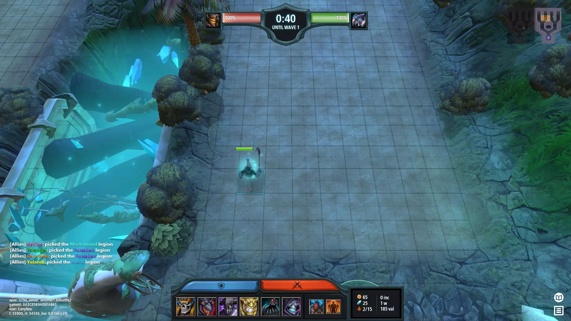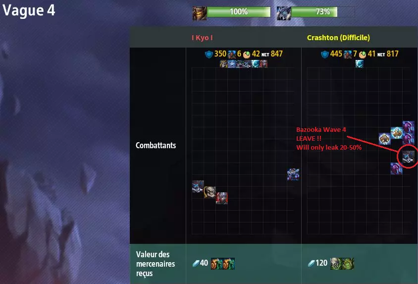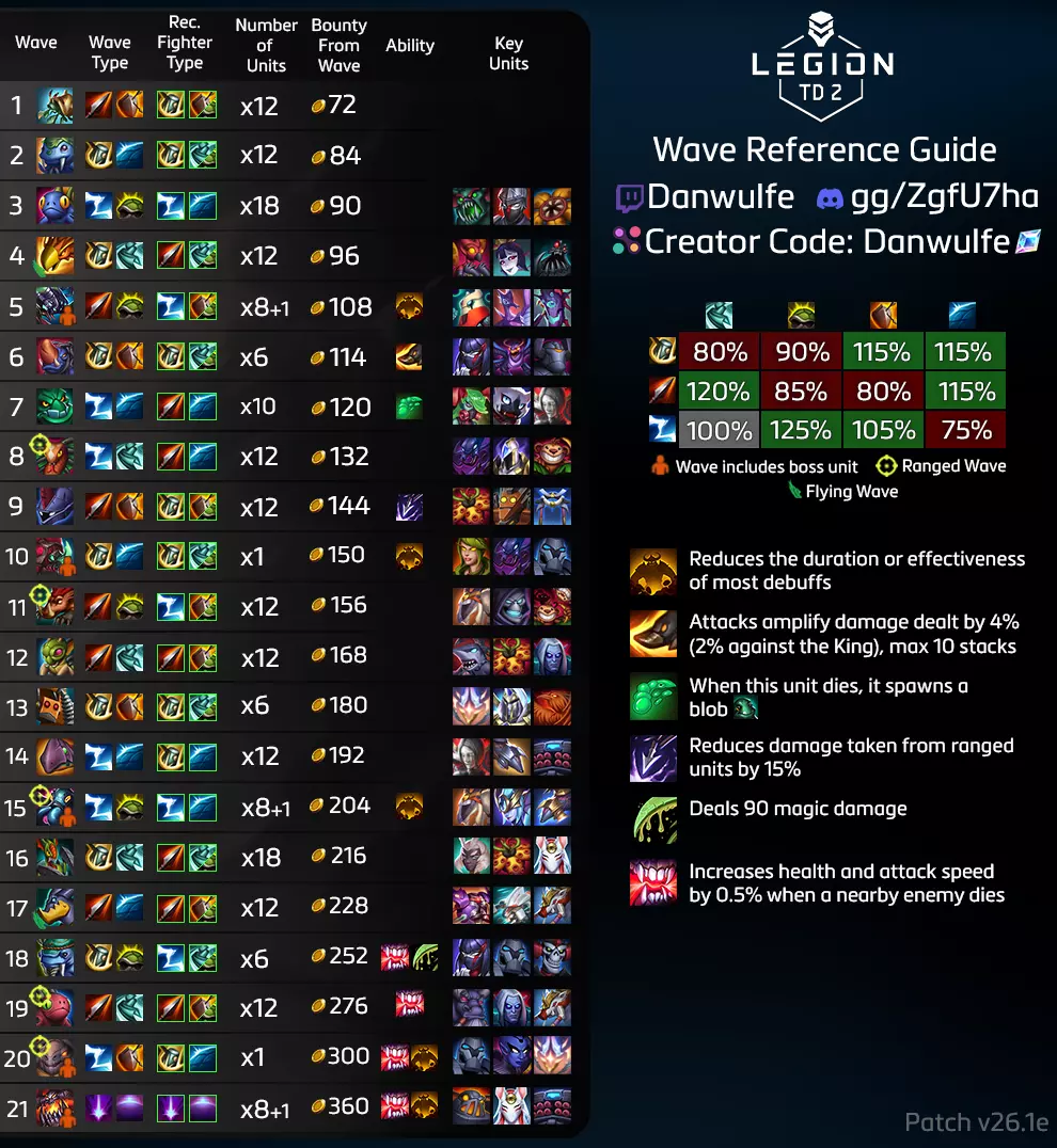 Within this guide, learn how to improve your gameplay up from the basic tutorial available in game. Those advanced notions paired with building improvements will make you a better player and battle for the highest ranks or just enjoy the game's depth better. Introduction This guide is being created to help the players get beyond their current skill level if they ever feel like they are stuck in a certain rank. This guide takes into consideration that the reader has an understanding of units, typing and basic positioning. We will not cover any type of specific positioning or wave by wave decision so that the guide remains in-temporal. First we will treat about how the reader should approach his fighter choices. From it, we will guide the reader unto how he should approach the game according to that given roll and how it should be use to set the pace of the game. We will end upon a more general section aiming at helping the reader better finding opportunities in the game. Picking your roll/ Minimising your weak waves When choosing your roll, it is important to find some specific things that are not always well characterised by the game coach recommendations. When in the game, depending on your mastermind option you want to look for the followings : Good late game options in case the game goes past wave 15. A strong opener to help you generate a lead with high push potential. Since Early game workers are the most crucial. Answers for your core build weak waves. It is important to note that the reroll button can be used to cover one of those points, but it is still good to look at your roll for those options. The main takeaway is that, one can not reach the late game if the early game is lost, meaning that an opener is often more important than a late game synergy. Be aware that you are, to a certain extent, controlling what the opponent will do in term of sending you. Recognising your weak waves and playing around them is the key of being able to pick a good roll. When looking at openers and how to defend them, look for the following tips to make the best decision possible: Units covering a large range of waves due to their early game focused ability or innate strong stats can help you shift gold more easily. (It can also be done with the Grarl) Unit upgrades are often more valuable than their base form. Look at how you can get an upgrade as early as possible. Long saves are more easily defended with expensive fighters. Preparing early to get them on a specific wave can be extremely valuable. Those tips are very general since how the player defends against the enemy is dependent on their send pattern and also their openers. If you are in a game where the enemy is sending a lot, you are able to push more aggressively, but keep in mind that the best push comes out of what we call power spikes. Power spikes happen when the player gets a fighter that is worth more value than its cost because of various reasons listed here: Utilising the fighter's ability optimally. Utilising synergies (auras or abilities) with good units. Utilising positioning (split aggro) to manipulate the wave and mercenaries. Utilising units that increase the odds or minimise the odds of targeting mercenaries (AoE/Consort ability). All of those can't be quantified by a number in game and can only be approximated by experience. For example, if you have lifesteal on a Nightmare, you know you have higher survivability and can hold larger sends when on value but can still deal reasonably well with sends while being 100-200 value under depending on the current wave. In the mid-game, when your Nightmare is upgraded to a Doppelganger, you know your weakness is against Four Eyes and so, when they can reach it, your approximate value diminishes slightly. Also, even if this is almost only positive value increases, there are some situations that diminishes the approximate value. Here are some example : Over-investment in low tier fighters. Even if they can be invaluable to adjust split, some players have a tendency to place more of them than necessary just because the recommended value colour changes to a more comforting one. Placing a high cost fighter in immediate death situations. Fighters always perform better when they either share aggro or are protected to let them do damage. This becomes more and more true as the value of the fighter increases. If they die within the first seconds, you basically remove that fighter value from your board. Placing a lopsided amount of DPS/Tank. Having too much of one or the other will cause some issue since they need to be in harmony to maximise your board value since DPS fighters need time to deal their damage and Tank fighters give that time. However, no matter how much time those can give you, the wave needs to be dealt with at one point, since they can only take so much damage. Remember that you are not alone and your teammate is there too. If both players have rolls that complement each other (no common weak waves), it diminishes the chances that a long save will be effective against you and also allow you to have better agency of the late game lines of action. Also, this is a team game and having this kind of habit will reduce the amount of effective weak waves of your team. DO NOT over rely on your teammate to cover your weak waves as there is a possibility that you lose too many resources to make the game state in your favour. This is all to set you up to play around what is called "the main lines" of both teams and give you the best flexibility over those ever evolving lines to adapt to your opponents. Identifying teams main sending line Once you are able to minimise your weak waves, you have basically identified the main line that should be used against you with your opener. The line that you show to your opponent will vary as you add more and more information. That is why hiding information in Legion TD 2 can be quite an effective weapon against your opponent as it forces them into a l