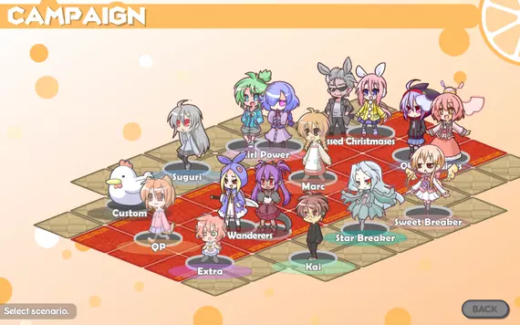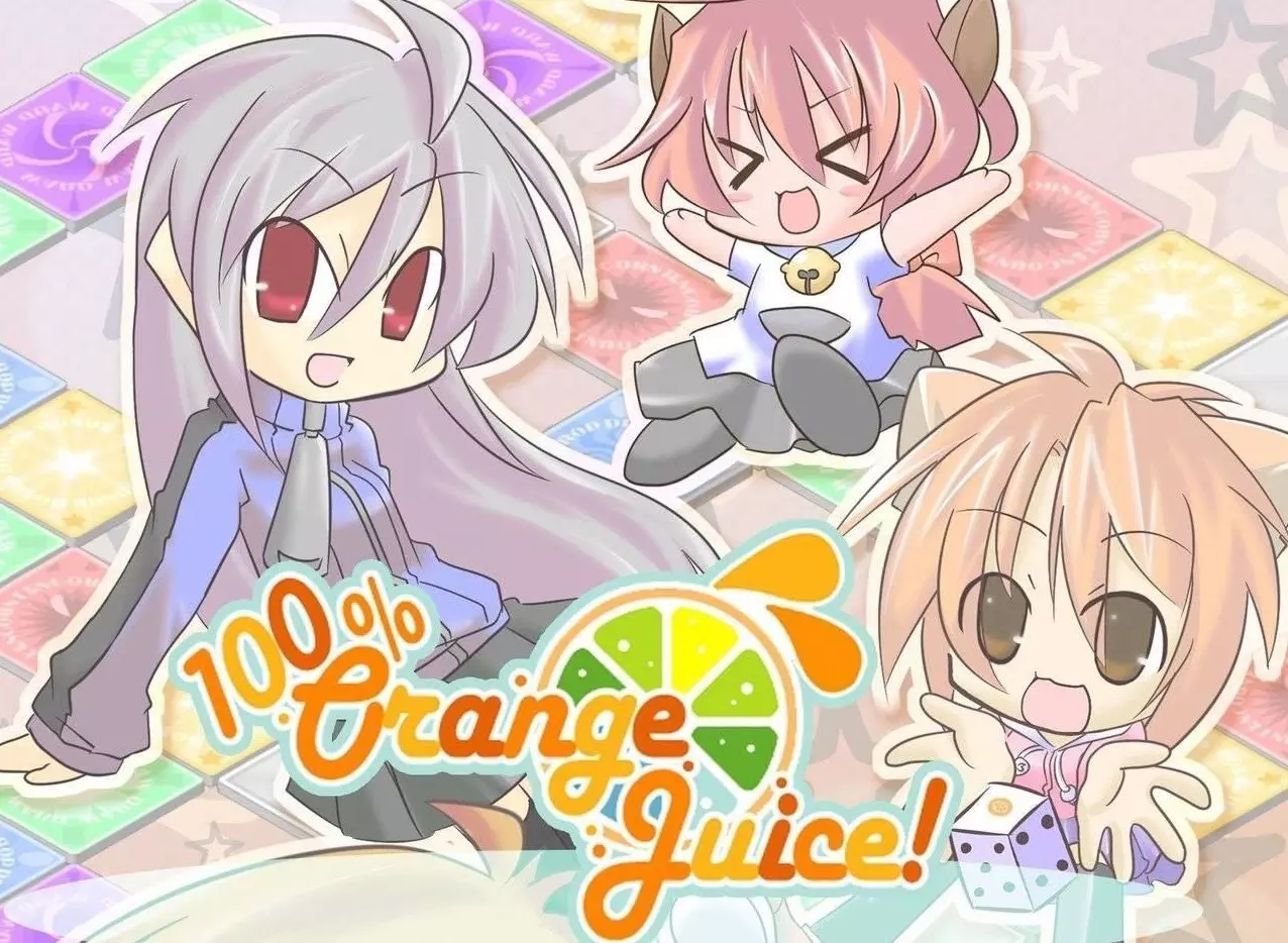 An online manual with all the basic info you need to play 100% Orange Juice. Welcome to 100% Orange Juice! This is a virtual board game for up to four players, featuring a crossover of characters from various games made by the developer Orange_Juice. To start playing, pick a starter character. Any one will do. I started with Marc, but Kai and QP are also easy to learn. Suguri works too but you'll need to understand how evade works. Enter campaign mode to play pre-designed scenario matches to advance the story (which also gives you some unlocks as you play through it), or do free play in single-player or multiplayer. You can choose to play in Normal (PVP) mode, which is the original game mode, or Co-op mode, which was added later. This guide is mostly about Normal mode, though many of the basic mechanics apply to both modes. All campaigns (that currently exist) are PVP. FYI, you can get all the game's content in one profile/save slot, including all four starters. Also, you can click the "GUIDE" button in the main menu to go over some of the basic mechanics. What to do in a match In this game, you decide how to play things on your turn, then roll dice to see how they play out. What you want to do is to achieve "normas" (conditions) involving having enough stars (basically an in-game currency) or win points (from fighting things and winning), then stop on home panels to do norma checks to level up. Everyone starts at norma level 1. Norma level is indicated by the big stars beside corner profiles in a match. In Normal (PVP) mode, your objective is to be the first player to go beyond level 5. In co-op mode, your objective is to defeat the boss. You can still achieve normas, and that may be useful, but there's no final norma for winning the match. Also, norma requirements are higher, but all players share them and work together, and any player can norma-check, and both stars and wins normas are active (i.e. hitting either requirement works). Every time it's your turn, you choose whether to use cards, roll to move, pick the paths you take, and decide whether/how you fight other players. Then, when you stop on a panel, you get that panel's effect. These are the panel types: Home: marked by a signpost with a player number and color. Stop here to do a norma check; you'll level up if you've achieved your norma. Home panels also heal 1 HP, only up to max HP. You start the game on your own home panel; when you pass your own home panel (but not others'), you can choose whether to stop. Bonus: yellow panel; roll dice to get [roll] x [your norma level] stars. In normal mode, this norma level multiplier caps at 3; in co-op it goes up to 5. Drop: blue panel; roll dice to lose [roll] x [your norma level] stars. (Norma level multiplier is not capped like for Bonus.) Draw: green panel; draw a card. Encounter: red panel; face a random enemy unit in a dice battle. When someone reaches norma level 4 for the first time, this is replaced with a Boss panel. (If a boss was already present before this happened, a second boss will be queued and will appear the chapter after the first one was defeated.) Boss: dark red panel; face this map's boss in a dice battle. When the boss is defeated, it reverts to an Encounter panel. A special Boss panel appears in some co-op maps to mark where the boss spawns, and is a permanent Boss panel. Warp: purple panel; teleport to any Warp or Warp & Move panel (with some exceptions). Roll and Move: turquoise panel; roll and move again. Warp and Move: purple panel; it's a combination of Warp then Roll and Move. Heal: pink panel; recover 1 HP, up to max HP. Damage: red/orange panel with missile icon; take 1 damage. ice panel or frozen panel: white panel with icy gleam, or frosted-over panel that's normally something else; slide over this panel without using a move count. This panel's effects are ignored. You can stop to battle someone on this type of panel, but after you fight them you'll continue sliding. blank panel: grey panel; no effect. any panel with "2x": For Bonus/Drop/Move, roll two dice. For Draw, draw two cards. For Encounter, get two wins if you defeat the enemy. For Heal/Damage, recover or lose 2 HP. Every time you level up, choose between stars or wins norma for your next norma. Choose wisely, since you can't change or skip it. to get to level 2: 10 stars (for most characters) (co-op: 15 stars and/or 2 wins) to get to level 3: 30 stars or 2 wins (co-op: 45 stars and/or 4 wins) to get to level 4: 70 stars or 5 wins (co-op: 105 stars and/or 10 wins) to get to level 5: 120 stars or 9 wins (co-op: 180 stars and/or 18 wins) to win the match: 200 stars or 14 wins You gain stars from... automatically every round, a gradually increasing amount as the game progresses landing on bonus panels some card effects when you win battles: you gain half the stars (rounded down) of the player you defeat in battle. Enemies/bosses will instead give you their small base amount of stars plus all the stars they got from defeating players in battle. You lose stars from... spending them to play cards (cost is on the right side of the card; green = 1 star, yellow = 10 stars, grey = variable) landing on drop panels some card effects when you are KO'd in battle Wins (a.k.a. win points, victory points) are gained by striking the final blow that KOs opponents in battle. You cannot lose wins, but they are harder to obtain. You get: 1 win for defeating a regular enemy, 2 wins for defeating a rival player unit, 3 wins for defeating a boss. When you land on a Encounter or Boss panel, you challenge an enemy to a battle, and you get the first attack. Regular enemies start at 3 HP and reset when they are defeated. There are three different regular enemies; which enemy you battle is randomly chosen. (Co-op mode may change this.) In Normal (PVP) mode, bosses are map-specific, start at full HP, do not heal or respawn, and are tougher than normal enemies. The match's winner is the first one to get the final norma; th