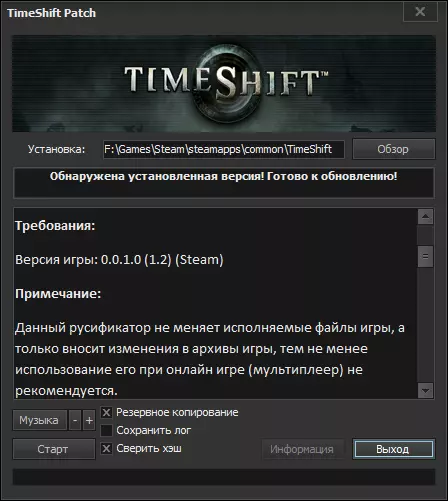 此俄语化补丁包含完整翻译。 信息 游戏版本:Steam 翻译类型:文本+语音 作者:SoftClub 安装 将压缩包中的“TimeShift”文件夹复制并粘贴到游戏根目录文件夹中,同意替换文件。