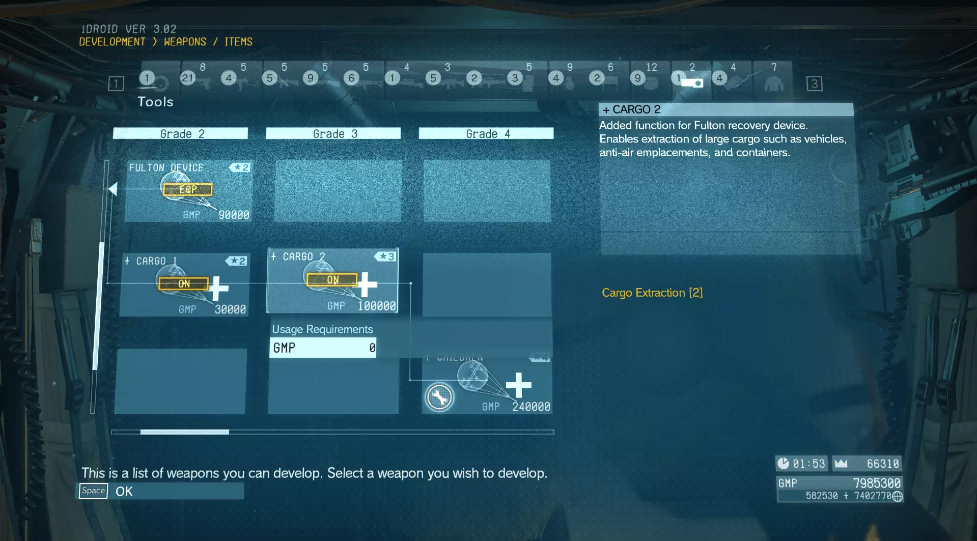 -尽早完成尽可能多的支线任务,这样可以快速解锁开发项目并积累GMP。 -不要射杀静静,她绝对是游戏中最棒的伙伴。 -潜行服是最棒的服装,一定要获取。 -尽可能用富尔顿回收系统回收坦克。 -最好的狙击步枪是布伦南,它需要蓝图,所以要去做支线任务。 -在骷髅部队任务中,除了“金属古菌”任务外,都使用D-horse;“金属古菌”任务则使用静静和“罪恶蝴蝶”步枪。 -快速完成任务更容易获得S级评价,所以尽量加快速度。 -烟雾弹在对付装甲单位、聚集的敌人以及“完全潜行”任务时非常有用,你可以在敌人被眩晕时走向他们,使用CQC(近身格斗)将其击杀或制服。-在隐蔽的地方放置C4总是有帮助的,这样当你即将被发现时,可以引爆它来分散敌人的注意力。 -如果敌人发现了你的载具,他们会摧毁它,所以要把载具放在不挡道的地方。 -如果你遇到坦克或直升机之类的敌方载具,而你没有合适的武器,可以使用前哨站的炮塔。 提示 提示
