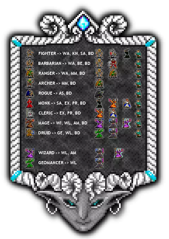 ### 吟游诗人职业基础指南 #### 吟游诗人概述 吟游诗人职业在诸多方面都独具特色。所有基础职业都可转变成吟游诗人,这能创造出许多极具趣味性的角色。吟游诗人还拥有其他职业所不具备的能力与游戏机制。 吟游诗人本质上是辅助型角色,他们演奏各式各样的歌曲来强化队友、削弱敌人,并召唤盟友协助战斗。不过,吟游诗人的角色定位也会因其基础职业而有很大差异。例如,战士系吟游诗人或许更倾向于与同伴一同冲锋在战斗前线,而法师系吟游诗人通常更喜欢在安全距离外施展法术。吟游诗人每级仅获得1点天赋点(所有职业中的最低值),并且在升级时会获得以下固定加成:生命值、速度+2,力量、敏捷、天赋点+2,闪避+2,法术值+3。 技能 吟游诗人职业除了其基础职业可能已训练的任何技能外,还能使用广泛的技能。不过,虽然吟游诗人保留其原职业技能的使用权,但请注意吟游诗人职业本身设定了自己的技能上限。这意味着任何希望训练到超过吟游诗人上限的技能,都必须在转成吟游诗人之前完成。单手刀剑类 - 匕首、短剑、长剑、宽剑、神秘之剑、工匠之剑、灵魂之剑、迅捷之刃、詹比亚弯刀、力量打击者、暗影之刃 单手钝器类 - 钉头锤、连枷、权杖、晨星锤、夜灵球、审判者 双手斧/双手刀剑/双手钝器 - 吟游诗人无法装备此类武器! 项链、腰带、披风及戒指 - 吟游诗人可装备所有种类的这些物品。护甲 - 皮甲、环甲、鳞甲、链甲、布袍、法师束腰衣、丝绸束腰衣、地狱皮甲、夜壳甲 靴子 - 皮靴、皮鞋、硬靴、精灵靴、幽暗鞋、神秘护胫、踢击靴、寒霜靴 手套 - 手套、精灵手套、虚空手套、空气手套、法师手套 头盔 - 皮帽、链甲头巾、王冠、夜面盔、恶魔帽、地狱头环、星辰头环、巫妖王冠、沙漠帽 副武器 - 左手短剑 远程武器 - 投石索、精灵投石索、符文投石索、长弓、短弓、战弓、复合弓、精灵弓、天空弓、守护弓、打击者、绽放弓、弧光弓、回旋镖 盾牌 - 小圆盾、风盘盾、光环盾 法杖 - 法杖、多节法杖、竞争者法杖、救赎者法杖 徒手武器 - cestuses、指节套 吟游诗人训练师在各地散落着8名吟游诗人训练师(从第二章开始出现)。大多数训练师专精于一项吟游诗人技能,并且大多数还出售一种吟游诗人乐器。以下是各训练师的详细信息: 名称 位置 吟游技能 第二章上限 第三章上限 乐器 汀·安格弗雷斯隆 城堡 全部 30-35 45-55 各式乐器 福泰欣 outlaw营地 抖掉负面效果 60 70 尤克里里 希尔莫林 前哨站 知识之诗 60 70 小号 拉约 精灵城 夜之圣歌 70 70 竖琴 拉多克 河城 走音 60 70 风笛 帕特里夫西 德鲁伊之湾 召唤老鼠 60 70 长笛 塞尔格兰 矮人城 醉酒 无 87 鼓 斯克利罗·特拉古迪 塔尔特索斯 无 无 无 各式乐器 职业策略 由于游戏中所有基础职业都能转成吟游诗人,因此培养吟游诗人角色有许多策略。以下是规划不同基础职业时需考虑的一些要点。战士 战士-吟游诗人是强大的近战 combatant,拥有出色的武器技能(首选单手 blades,上限60)和军事训练(上限70)。这类吟游诗人生命值高,能切实协助你的主要前排角色造成伤害。 野蛮人 野蛮人-吟游诗人与战士类似,但部分武器的上限略高(记得避开双手武器),生命值更多,还能使用狂怒(上限55)和更高等级的肩撞(上限85)。这类吟游诗人是生存能力最强的选择,狂怒时能爆发更高的DPS。 游侠 游侠-吟游诗人应专注于单手 blades(上限50)和/或远程武器(上限42)。游侠还能获得精准射击技能,不过其影响较小,因为它提升缓慢,每4级仅增加1点。自然盟友(90级上限)可能会有用,但优势不大,因为吟游诗人已经可以通过歌曲召唤各种生物。说实话,游侠-吟游诗人在近战方面不如战士/野蛮人,远程方面不如弓箭手,所以你或许最好选择这些基础职业之一。 弓箭手 弓箭手-吟游诗人是非常不错的组合,拥有较高的远程技能(65级上限)和精准射击(99级上限),此外吟游诗人几乎可以装备除十字弓和凤凰弓外的所有远程武器。火焰箭(40级上限)和坚定意志(55级上限)技能可能也会派上用场。 盗贼 盗贼-吟游诗人可能希望专注于单手刀剑(45级上限)或徒手武器(45级上限)、闪避(60级上限)、暗影步(30级上限),当然还有背刺(50级上限)。盗贼的其他几项技能也超过了吟游诗人,因此在切换职业前,或许最好将这些技能点满:灵活(上限40)、开锁(上限60)以及无处可逃(上限45)。 僧侣 僧侣-吟游诗人或许是个全能型角色,能够在战斗、治疗和施法方面都具备不错的熟练度。一定要选择徒手攻击(上限65)或法杖(上限55),同时还要学习闪避(上限70)、神圣祷言(上限30)和驱邪(上限1)。吟游诗人的法术上限已经超过了僧侣的大部分法术,除了治疗光环(上限1)、神圣打击(上限40)和神圣等离子(上限10)。 牧师 牧师-吟游诗人是一种有趣的组合,能够提供所有组合中最佳的治疗和抗亡灵能力。拥有强效治疗法术(上限55)、比僧侣更出色的神圣技能,以及吟游诗人的歌曲库,这种组合能成为强大的辅助角色,甚至可能作为某些队伍的主要治疗者。 法师 法师-吟游诗人组合对大多数法术(治疗、抵抗邪恶和雷击除外)拥有显著更高的上限,并且能使用更广泛的法术,包括一些范围伤害类型。切换职业前,务必将魔法知识(上限70)和魔力超频(上限30)提升至满级。 德鲁伊 德鲁伊-吟游诗人组合获得了进攻与防御法术的均衡提升,例如治疗(上限30)、所有元素