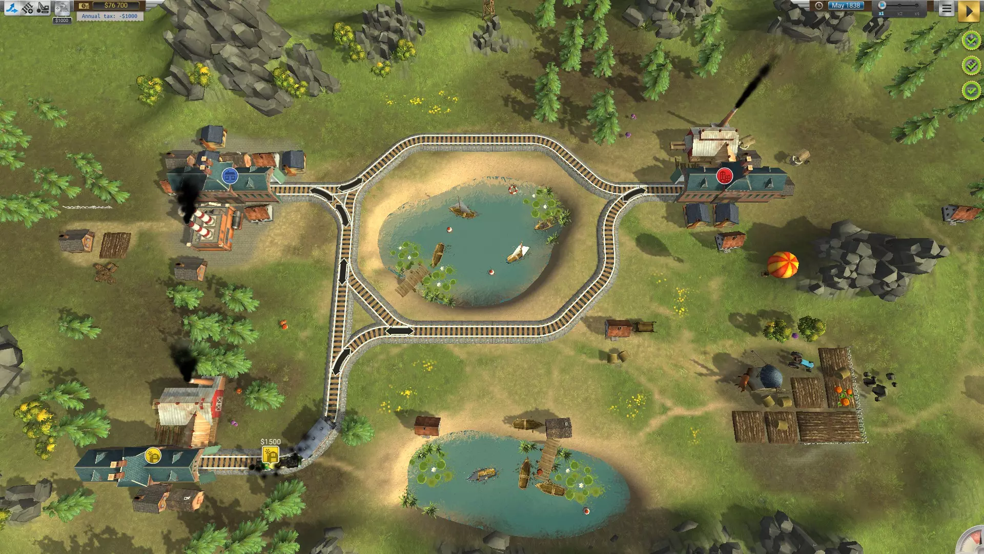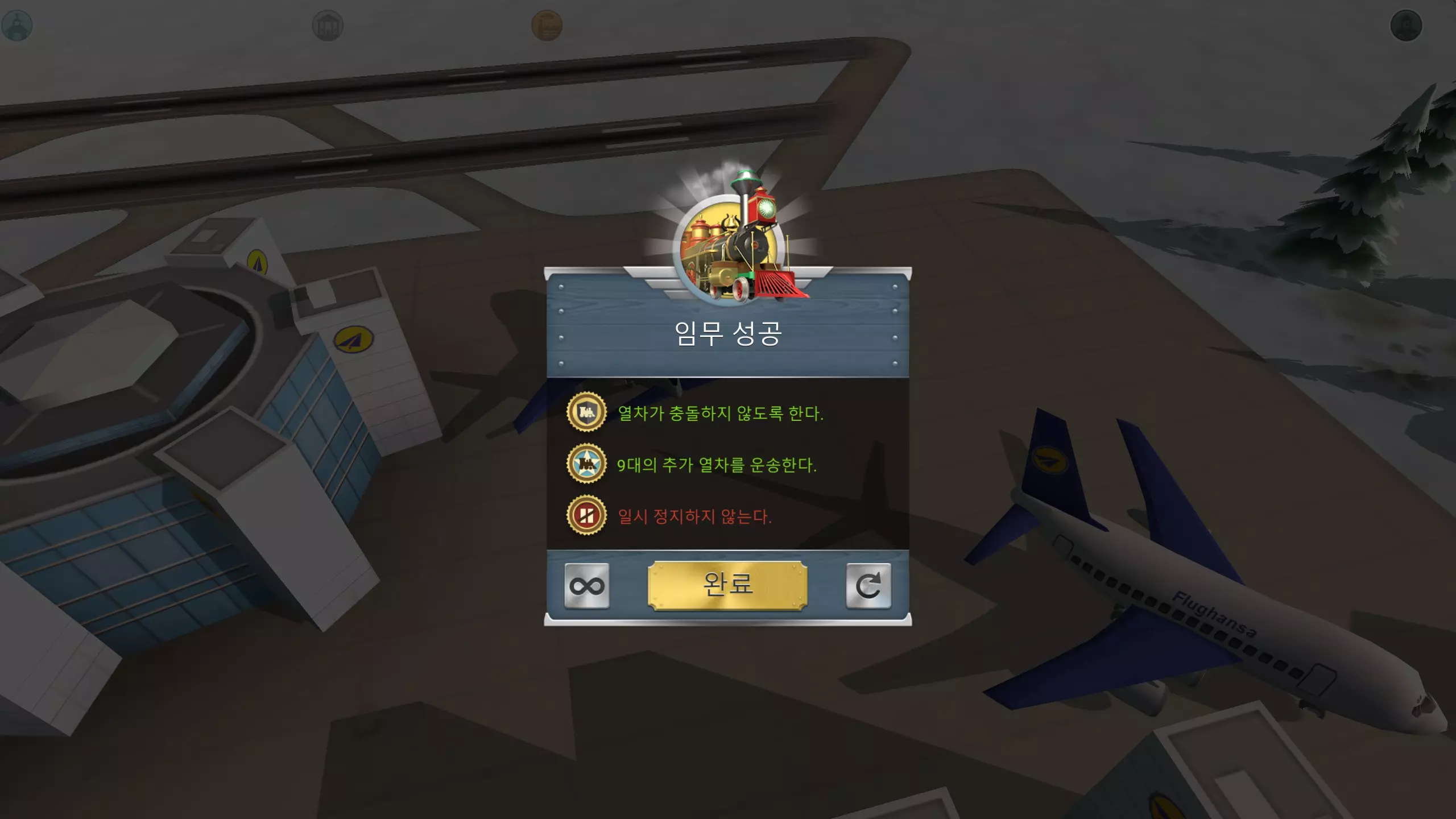 当八个车站都装满后,暂停游戏并从车站发车。同时,启动那两辆停放的火车——不要忘记它们!确认所有十辆火车上方都显示【行驶中】图标后,取消暂停游戏。列车很可能在几秒钟后全部相撞,但没关系——它们只需要同时移动几秒钟,而且你应该还剩下超过10万美元,这足够用来修复损坏的轨道,并让最后几列火车完成运输以通过关卡。