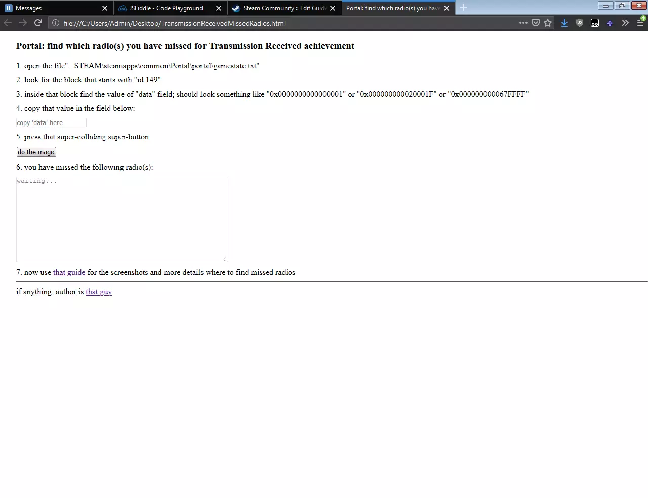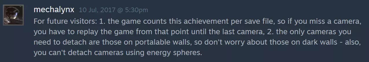 What to do when "completed" Portal achievements don't show as unlocked on Steam. Plus general help with achievement problems. The Problem Achievements show as unlocked or completed on the in-game menu, but not on Steam. Possible causes:There is something unreliable about the way Portal communicates with Steam. Temporary loss of connection with the internet or Steam server. Two players are using Portal on the same computer (either they both own the game, or are using Family Sharing). Achievements may only unlock for the first player who completes them. If an achievement does NOT show as unlocked on the in-game menu, then not all of the requirements for the achievement have been met. Achievements will NOT unlock in these cases:Steam Client in Offline Mode, or loss of connection while playing. Cheats active (sv_cheats 1) at any time during your play session. Commentary mode (it activates cheats)If you play in commentary mode and then play an advanced chamber or challenge map, commentary (and cheats) will remain active. Commentary nodes will be visible in challenge maps, but not in advanced chambers. To ensure commentary mode is off, start a New Game in story mode and then re-start the advanced chamber or challenge via Bonus Maps. THE FIX Quit Portal, if it is running. Rename *(or delete) the file ... steam steamapps common portal portal gamestate.txt ( or this file if playing the "Portal with RTX" DLC: ... steam steamapps common PortalRTX portal_rtx gamestate.txt ) Make sure you are online AND connected to Steam. Then start Portal, (do NOT view the Achievements menu yet) and replay the part relevant to the achievement:Story mode achievements - replay that part. "Cake" achievements - complete ONE advanced chamber. "Science" achievements - complete ONE challenge (at least bronze medal). (This will not affect any achievements already unlocked on Steam.) * If you are part-way through the Transmission Received achievement, "rename" the file to keep as a backup copy (for example: "gamestate.txt.bak" or "gamestate - Copy.txt"), and read below. More Information To easily find where your game files are stored: In your Steam Library, select Portal, select Manage (gear icon), then Manage > Browse local files If you have the "Hide extensions for known file types" option enabled in your file browser, the file name should appear as "gamestate", with the "Text Document" type. Portal uses a local file named gamestate.txt (shared by all players using the same computer) to record progress with achievements - if they are already unlocked, they won't be triggered a second time. The gamestate.txt file is not part of the original install of the game. It is only created AFTER you have made achievement progress. When you start Portal, the game checks both the local gamestate.txt file and the online list of achievements associated with your Steam account, and combines them in to the list of achievements displayed in-game. Each time you quit Portal, the gamestate.txt file gets re-created based on the combined progress. After using the fix, you can delete the new file and replace it with the file you renamed earlier. (Previous progress on Transmission Received will be lost if you don't keep the original file.) In each case, you only need to replay the exact moment where the achievement is triggered. So use a saved game, if you have one (unless cheats or commentary were active). If that doesn't work, try starting a New Game from the nearest chapter. Since the problem is about Portal communicating with Steam, even the fix may not work the first time - so TRY AGAIN! Transmission Received Before you can start on this one, you first need to have unlocked the Heartbreaker achievement for completing Portal. Only then will the extra/modified radios appear. If you still don't see all the radios, make sure they have not been disabled: https://steamcommunity.com/sharedfiles/filedetails/?id=432359161 The "fix" above will not help with Transmission Received, unless you want to find ALL of the radios again. Progress is stored in the gamestate.txt file, which is not saved to the Steam Cloud, so ALL radios must be found on the same PC/device. The radio transmissions can be received in any order, across multiple playthroughs, and only need to be done once. Open the file ... steam steamapps common portal portal gamestate.txt At the end of the file will be a section starting with "id" "149". The value next to "data" is used to record progress toward the achievement: 0x0000000000000000 (no transmissions received) 0x0000000003FFFFFF (ALL transmissions received) To determine which radio transmissions have already been received, take the last seven (7) digits of the "data" value and convert each digit from hexadecimal to 4-bit binary. Hex: 0 1 2 3 4 5 6 7 8 9 A B C D E F Bin: 0000 0001 0010 0011 0100 0101 0110 0111 1000 1001 1010 1011 1100 1101 1110 1111 Examples (Hex -->> Bin): 29EF7FF -->> 0010 1001 1110 1111 0111 1111 1111 (missed #12, #17, #22, #23 & #25) 3FFFFFF -->> 0011 1111 1111 1111 1111 1111 1111Then, reading from RIGHT-TO-LEFT, the binary digits indicate whether a radio transmission has been received (1) or not (0). (The two left digits will always be zeros.) The order the radios can be found in the game is slightly different to the order they are recorded in the "data" value. For a full cross-referenced list of locations, refer to this guide by rarestMeow https://steamcommunity.com/sharedfiles/filedetails/?id=2157802426 Other things to try Verify Integrity of Game Files: https://support.steampowered.com/kb_article.php?ref=2037-QEUH-3335 Clear Download Cache: https://support.steampowered.com/kb_article.php?ref=3134-TIAL-4638 Similar fix for Half-Life 2 https://steamcommunity.com/sharedfiles/filedetails/?id=423124097