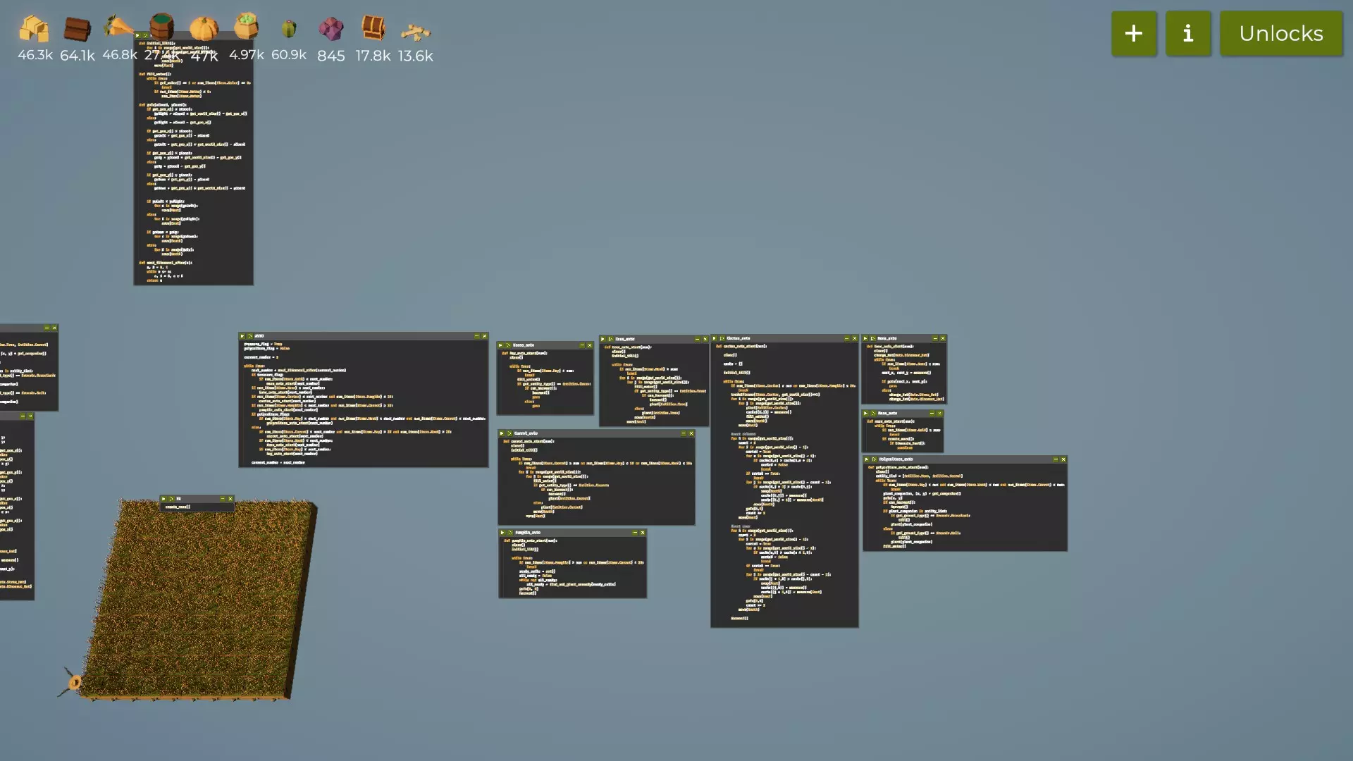 It's the cactus farm, with explanations inside the code as comments. You can just copy and paste it in a new file. So, spoilers...I guess. Assorted sorted cacti code: W = get_world_size() WATER_THRESHOLD = 0.75 # ---------- Movement helpers ---------- def go_home(): # Move to (0,0) without wiping the field (do NOT call clear() here). x = get_pos_x() y = get_pos_y() k = 0 while k < x: move(West) k += 1 k = 0 while k < y: move(South) k += 1 def serpentine_row_pass_east_west(): # Position assumed at (0,0). Traverse row by row in serpentine pattern. i = 0 eastward = True while i < W: steps = W - 1 s = 0 while s < steps: if eastward: move(East) else: move(West) s += 1 if i < W - 1: move(North) eastward = not eastward i += 1 def serpentine_row_pass_west_east(): # Same as above but starting by going West first. i = 0 eastward = False while i < W: steps = W - 1 s = 0 while s < steps: if eastward: move(East) else: move(West) s += 1 if i < W - 1: move(North) eastward = not eastward i += 1 # ---------- Tile helpers ---------- def ensure_soil_and_cactus_here(): if get_ground_type() != Grounds.Soil: till() ent = get_entity_type() if ent == None: plant(Entities.Cactus) else: if ent != Entities.Cactus: if can_harvest(): harvest() plant(Entities.Cactus) def maybe_water_after_plant(): if get_water() < WATER_THRESHOLD: use_item(Items.Water) # ---------- Field maintenance ---------- def fill_field_with_cactus(): # One sweep that ensures every tile is cactus on soil (no harvesting mature cacti here). go_home() i = 0 while i < W: j = 0 while j < W: ensure_soil_and_cactus_here() j += 1 if j < W: move(East) if i < W - 1: move(North) i += 1 def all_mature_cacti(): go_home() i = 0 all_ok = True while i < W: j = 0 while j < W: ent = get_entity_type() if ent != Entities.Cactus: all_ok = False else: if not can_harvest(): all_ok = False j += 1 if j < W: move(East) if i < W - 1: move(North) i += 1 return all_ok def trigger_cascade_harvest(): # Only harvest if every cactus is mature; otherwise wait for next cycle if all_mature_cacti(): go_home() if can_harvest(): harvest() # ---------- Sorting passes ---------- def row_compare_swap_pass(): # Bubble once across each row, comparing with the neighbor in the travel direction. # Returns True if any swap happened. go_home() swapped = False i = 0 eastward = True while i < W: # At the start of each row, set how many comparisons we can do j = 0 # We do W-1 comparisons per row, but the neighbor direction changes with 'eastward' while j < W - 1: if eastward: # We're somewhere from col 0..W-2: compare with East neighbor a = measure() # current b = measure(East) # neighbor if a > b: swap(East) swapped = True move(East) else: # Traveling West: we're somewhere from col W-1..1: compare with West neighbor a = measure() # current b = measure(West) # neighbor if a < b: # Put the smaller on the West: swap with West neighbor swap(West) swapped = True move(West) j += 1 # Go up a row and flip direction if i < W - 1: move(North) eastward = not eastward i += 1 return swapped def column_compare_swap_pass(): # Bubble once along each column, always comparing toward North (ascending). # Returns True if any swap happened. go_home() swapped = False col = 0 while col < W: row = 0 while row < W - 1: a = measure() # current b = measure(North) # neighbor above if a > b: swap(North) # put smaller below, larger above swapped = True move(North) row += 1 # go back down to y=0 before stepping to next column while row > 0: move(South) row -= 1 if col < W - 1: move(East) col += 1 return swapped def sort_field_rows_then_columns(): # Repeatedly apply row pass then column pass until no swaps. #This converges to a matrix that is sorted by rows and columns. # Classic alternating relaxation: row-bubble then column-bubble # Continue until a full cycle makes no changes. while True: any_swapped = False s1 = row_compare_swap_pass() if s1: any_swapped = True s2 = column_compare_swap_pass() if s2: any_swapped = True if not any_swapped: break # ---------- Harvest trigger ---------- def trigger_cascade_harvest(): # Harvest from (0,0) once the matrix is sorted and all are mature. go_home() if can_harvest(): harvest() # ---------- Main loop ---------- # 1) Ensure field is filled with cactus clear() fill_field_with_cactus() # 2) Maintenance loop while True: # Let everything grow; keep tiles cactus if anything was disturbed fill_field_with_cactus() go_home() i = 0 while i < W: j = 0 while j < W: if get_water() < WATER_THRESHOLD: use_item(Items.Water) j += 1 if j < W: move(East) if i < W - 1: move(North) i += 1 # 3) If (and only if) every cactus is mature, sort & harvest if all_mature_cacti(): sort_field_rows_then_columns() trigger_cascade_harvest() # After the cascade, the field is cleared—loop will refill and repeat.
