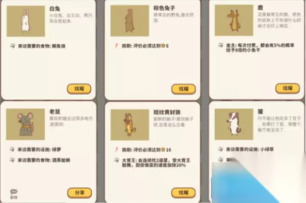 《动物餐厅》招揽摊主任务完成方式,游戏中成功招揽1位摊主是其中的一个任务,很多玩家不知道怎么完成,感兴趣的一起去看看吧! 《动物餐厅》招揽摊主任务攻略 用鱼塘里钓上来的鱼放到那个招牌里就可以招揽摊主了,这个比较看运气,要多放几次。 以上就是《《动物餐厅》招揽摊主任务完成方式》的全部内容了,希望对大家有帮助,是由[世界各地的拼图迷]进行整理。 版权声明:本文来自互联网,本站仅进行内容整理,如有侵犯你的权益请来信告知,我们核实后将进行删除;如果你觉得好,请将网址分享给你的朋友! 本文标签: 动物餐厅招揽摊主任务