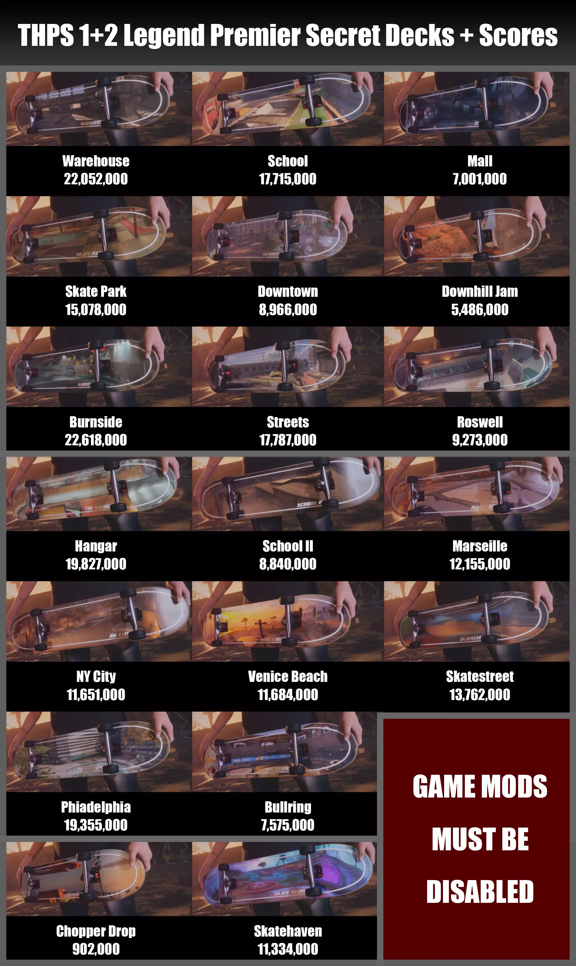 首先,你要进入技巧攻击模式的私人比赛。选择你想要解锁对应滑板的地图。一开始就结束本轮滑行,等待统计数据消失。当数据消失并进入自由滑行模式后,在暂停菜单中选择“启动”。在那里激活模组,但不要启动,直接退出菜单。现在你应该已启用所有模组。假设你要解锁仓库滑板,需要2200万分。完成一个特殊的边缘技巧并保持,直到得分达到220000分。当分数接近所需数值时,在保持技巧的同时切换不同的边缘技巧。继续这样做,直到达到100倍乘数。注意,此时不要离开边缘!在离开之前,返回“启动”菜单并禁用模组。将操纵杆保持在沿坡道向下的方向,同时禁用模组。之后你应该就能成功了。以下是各地图的分数要求: 仓库地图分数:在仓库地图获得超过22,052,000分。 学校地图分数:在学校地图获得超过17,715,000分。 商场地图分数:在商场地图获得超过7,001,000分。 滑板公园地图分数:在滑板公园地图获得超过15,078,000分。 市中心地图分数:在市中心地图获得超过8,966,000分。 下坡果酱地图分数:在下坡果酱地图获得超过5,486,000分。 伯恩赛德地图分数:在伯恩赛德地图获得超过22,618,000分。 街道地图分数:在街道地图获得超过17,787,000分。 罗斯威尔地图分数:在罗斯威尔地图获得超过9,273,000分。 机库地图分数:在机库地图获得超过19,827,000分。School II 得分:在 School II 获得 8,840,000 以上的分数。 Marseille 得分:在 Marseille 获得 12,155,000 以上的分数。 NY City 得分:在 NY City 获得 11,651,000 以上的分数。 Venice Beach 得分:在 Venice Beach 获得 11,684,000 以上的分数。 Skatestreet 得分:在 Skatestreet 获得 13,762,000 以上的分数。 Philadelphia 得分:在 Philadelphia 获得 19,355,000 以上的分数。 The Bullring 得分:在 The Bullring 获得 7,575,000 以上的分数。 Chopper Drop 得分:在 Chopper Drop 获得 902,000 以上的分数。 Skate Heaven 得分:在 Skate Heaven 获得 11,334,000 以上的分数。