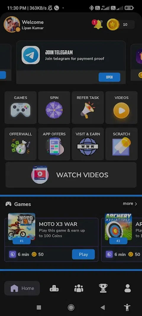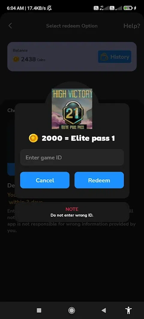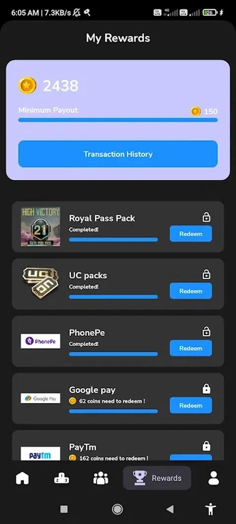 这是一款为用户提供游戏并赚取积分的应用程序。使用这些积分,用户可以兑换现金或 bgmi uc 和 Royalpass