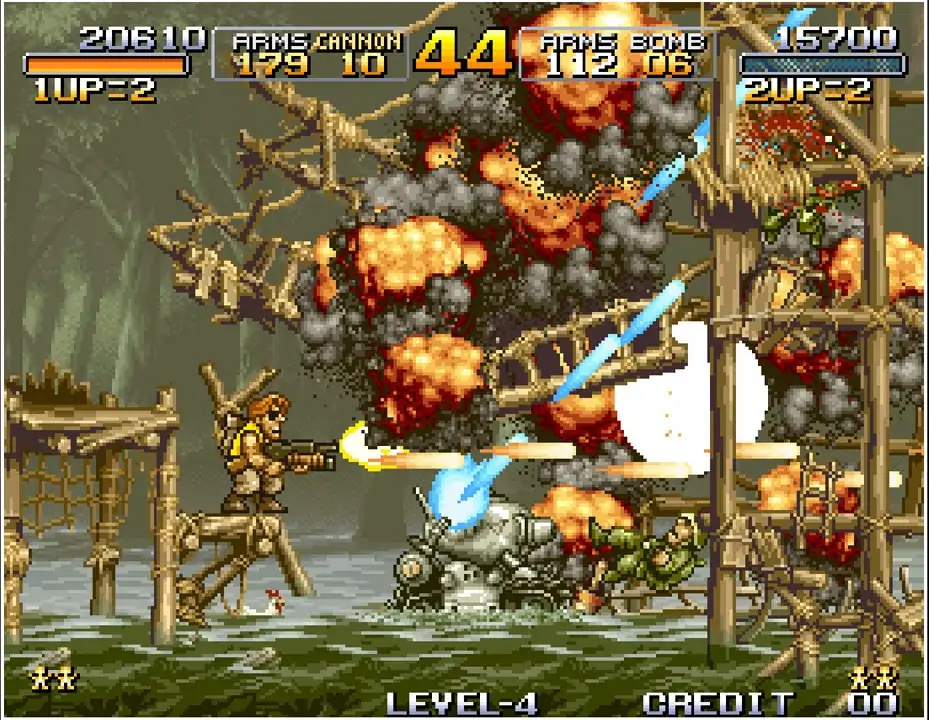 街机游戏《合金弹头》(Metal Slug)1996 年由 Nazca Corporation 开发、SNK 发行的 Neo Geo 平台横版射击开山作,凭 “跑轰” 爽感与双人协作玩法,成街机厅 “续币大户”,更奠定系列 “射击游戏标杆” 地位,是无数老玩家的青春记忆载体。 剧情聚焦硬核反恐任务:游隼小队的马可与塔尔玛,奉命追击发动叛乱的莫登将军 —— 其麾下大军窃取了秘密武器 “合金弹头”,妄图掌控世界。玩家需操控二人闯过层层关卡,击溃海量敌军与机械载具,最终直面巨型 BOSS,夺回失窃武器。 玩法堪称 “爽感教科书”:支持单人或双人联机,仅需摇杆 + 三键即可操作,上手简单却极具深度。初始配备手枪与手雷,沿途可捡重机枪、霰弹枪、火箭筒等强力武器,其中霰弹枪因 “贴脸清场快” 被玩家奉为 “近战神器”。标志性载具 “合金弹头” 战车更是关键,既能抗伤害又能重火力输出,成 “残血翻盘必备”。每关结尾的巨型 BOSS 战(如第一关改造战斗机 “哲雪”),需精准走位躲弹幕,配合武器切换攻克,难度虽有梯度却充满挑战。 民间社区满是情怀共鸣:双人联机时 “一人清杂兵、一人盯 BOSS” 是默契标配,常有 “抢霰弹枪拌嘴,却又帮队友挡子弹” 的名场面。Neo Geo 基板的永久分数保存功能,让街机厅排行榜成玩家荣誉殿堂,催生各类刷分技巧。老玩家笑称 “续币次数比通关次数多”,但听到武器拾取的清脆音效,仍会想起攥着硬币紧盯屏幕的时光。虽为像素画风,却凭紧凑节奏与合作快感,至今仍是模拟器上的 “射击启蒙必玩作”。