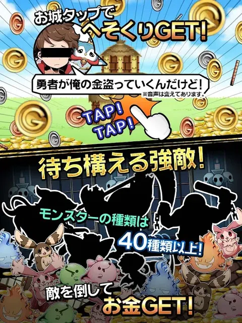 勇者大人的赚钱方式是击退怪物和…夺取国王的私房钱?! 点击城堡夺取废柴国王的私房钱吧! 放置不管钱就会越来越多?!连击变更多?!?惩戒魔王拿更多…?!?! 「不愧是勇者大人!」 简单却有趣!最适合拿来杀时间轻松玩的免费放置型RPG! ◆剧情◆ 因为先王驾崩,年纪轻轻就继位的现任国王是个不知人间疾苦又任性,而且还乱花钱的问题人物! 现任国王花钱花到王国快毁灭,再加上魔王带着怪物出现,这个王国快毁灭了! 啊啊、那位勇者大人!没错,就是您! 拜托请拯救这个王国…! 严惩怪物和国王,重建即将毁灭的王国吧! ◆游戏的进行方式◆ 1:夺取国王的私房钱! 点击越多次城堡会出现连击奖励,获得的金额就会提升! 2:开放冒险区! 召唤出栖息在冒险区里的怪物就可以存越来越多的钱! 3:将怪物进化! 将怪物进化后,从冒险区的怪物身上获得金额的速度会提升! 4:击退来捣乱的魔王或怪物! 打倒魔王或怪物就会掉落大量金币喔! 目标!成为亿万富翁!获得100京也不是梦! ◆适合以下的人玩◆ ・喜欢可以用来打发时间的免费游戏