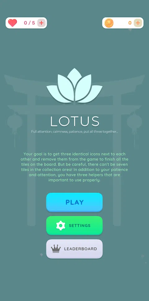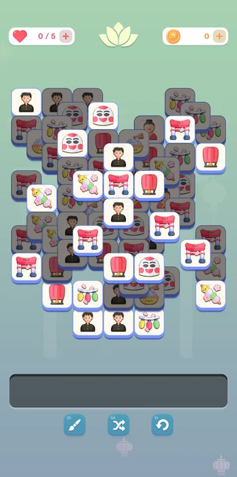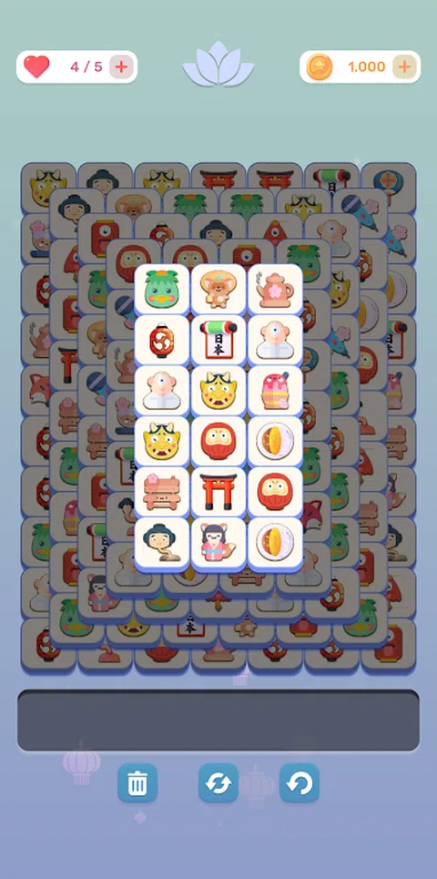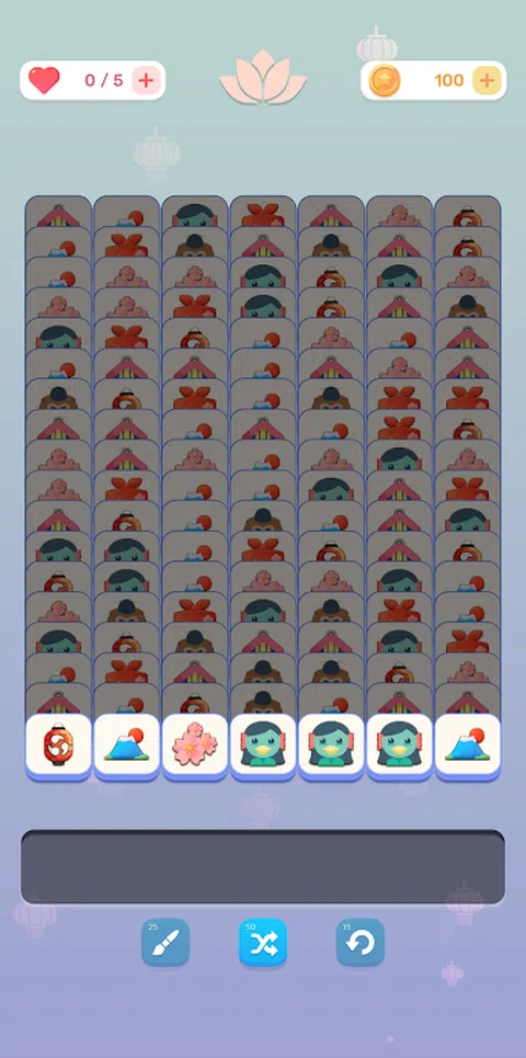 你的目标是让三个相同的图标彼此相邻,并将它们从游戏中移除以完成面板上的所有图块。 但是要小心,收集区不能有七个图块