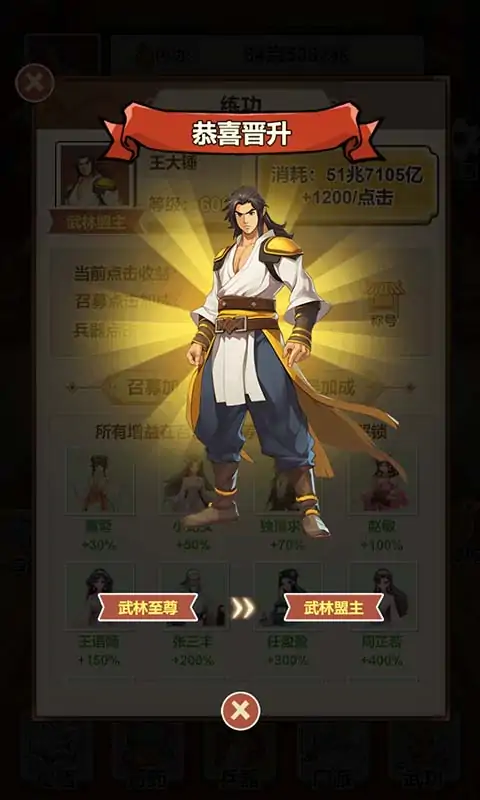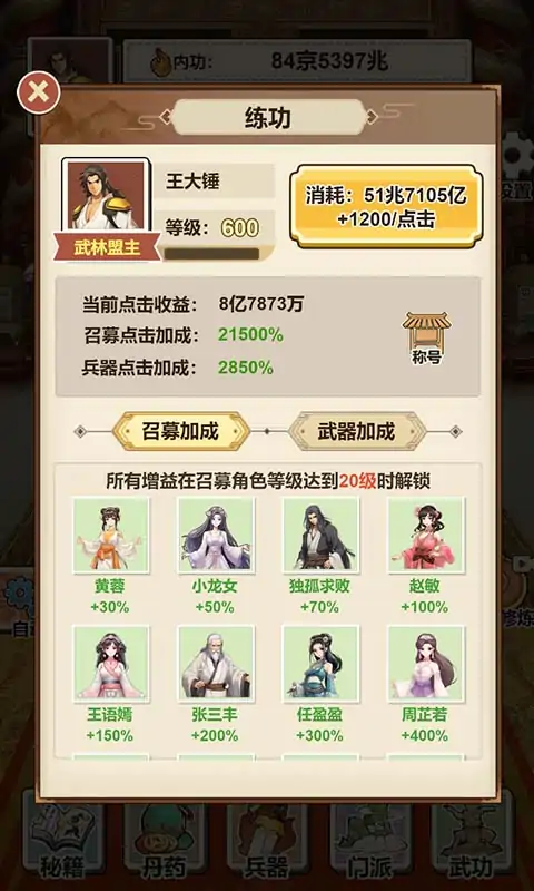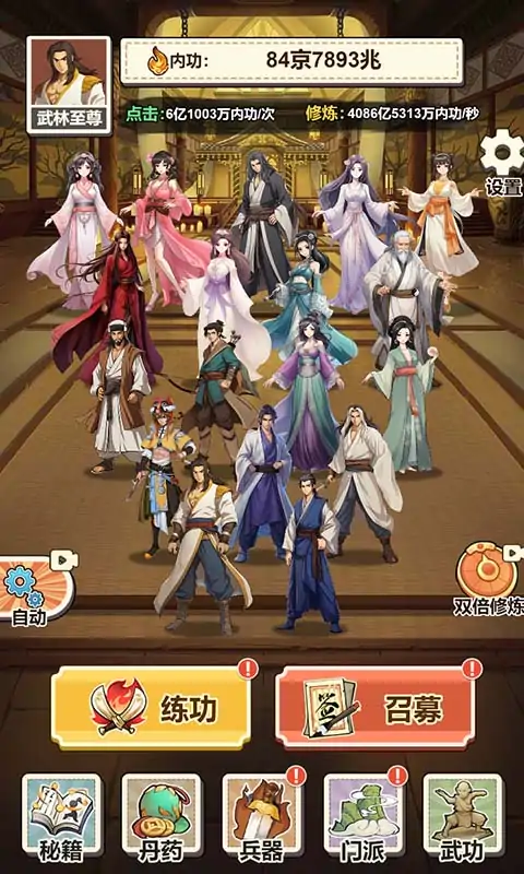 一款江湖练功模拟游戏,不断升级提升内功,招募初入江湖的武林中人一同修炼,从只身一人逐渐壮大自己的武林客栈,成为真正的武林之王!