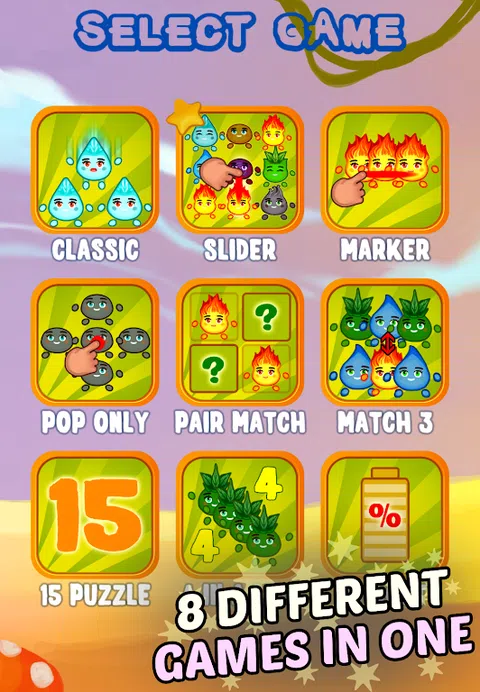 Splash and Boom: Elements是一套8个匹配3个大脑训练风格的益智游戏,拥有2000多个关卡。只需将相同的物品组成一行,然后将其从游戏面板中删除即可。击败关卡挑战并赢得硬币。这个游戏没有时间限制 - 享受无尽的乐趣。获胜并与其他玩家比较得分。Splash and Boom特别适合女性和女孩上瘾。 经典模式是一款原创的三消风格游戏,没有时间限制。在“关卡”模式下,游戏的目标是从面板上移除所有生物。为此,您必须在一行中形成3个或更多相同元素的组。在“挑战”(免费游戏)模式下,您必须移除尽可能多的生物。您在一行中放置的相同颜色的元素越多,分数就越高。 模式滑块是经典游戏的扩展版本,您还可以更改相邻元素的位置 在模式标记中,标记相邻相同元素的路径(水平、垂直或成角度) 在模式弹出,仅弹出相邻的相同生物组(垂直或水平相邻)。您的团体越快,人数越多,您获得的积分就越多。 配对模式是一款提高记忆力和注意力的游戏。尽快找到相同的元素对。 在匹配3中,您必须点击并滑动相邻元素,以在一行或一列中形成三个或更多元素的组。 十五拼图模式是一款滑动拼图游戏,您的目标是按升序放置图块 一行四人是一款经典的策略棋盘游戏,在 7x6 棋盘上玩。玩家轮流将他们的生物放入网格中。元素落下,占据列中的下一个可用空间。第一个获得垂直、水平或对角线四个元素的玩家获胜