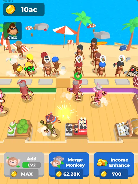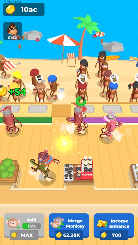猴子咖啡馆是一款令人愉悦且令人上瘾的休闲游戏,玩家可以在一些可爱的猴子的帮助下经营自己的咖啡馆。游戏的目的是在管理和升级员工的同时,为各种猴子顾客提供美味的饮料。 玩家可以雇用新的猴子在他们的咖啡馆工作,并且可以将三只相同类型的猴子合并以创建更高级别的工作人员。玩家拥有的工作人员越多,他们供应饮料和赚钱的速度就越快。 猴子咖啡馆拥有丰富多彩的图形和易于学习的游戏玩法,是一款适合所有年龄段玩家的有趣而引人入胜的游戏。游戏提供了各种挑战和目标,让玩家不断回来,追求更多,包括升级工作人员、解锁新饮料和获得成就。 在猴子咖啡馆中,玩家可以尽情地经营自己的咖啡馆,并为可爱的猴子顾客提供美味的饮料
