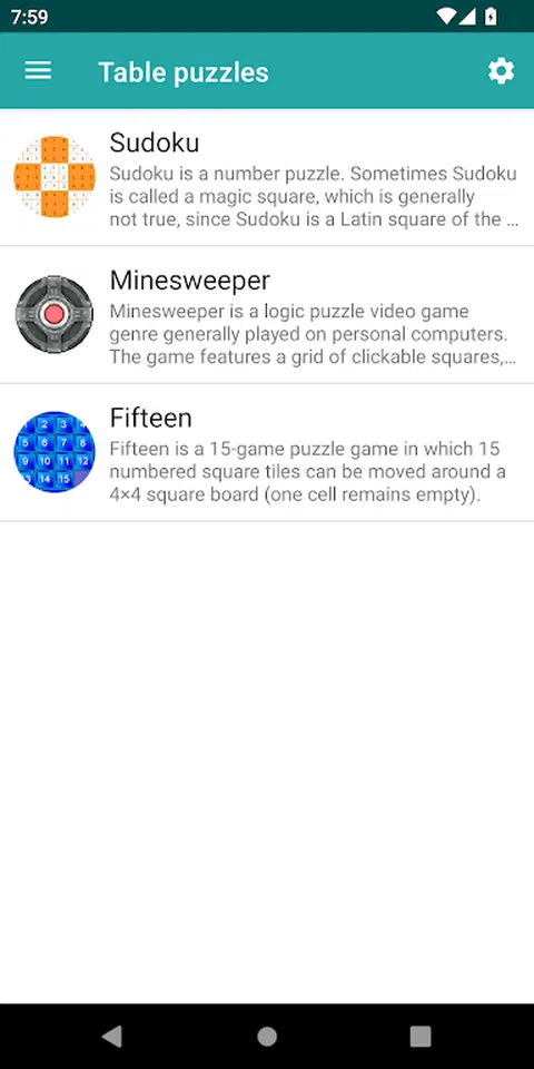 该应用程序包含流行的迷你益智游戏: 数独是一个数字谜题。有时数独被称为幻方,这通常不是真的,因为数独是 9 阶拉丁方。数独被世界许多国家的报纸和杂志积极出版,大量出版数独集合。解决数独是一种流行的消遣。 扫雷是一种逻辑益智视频游戏,通常在个人电脑上玩。游戏具有可点击的方格网格,隐藏的“地雷”散布在整个面板上。目标是在每个区域中相邻地雷数量的线索的帮助下,在不引爆任何地雷的情况下面板。 十五是一款包含 15 个游戏的益智游戏,其中 15 个带编号的方块可以在 4×4 的正方形面板上移动(一个单元格为空)