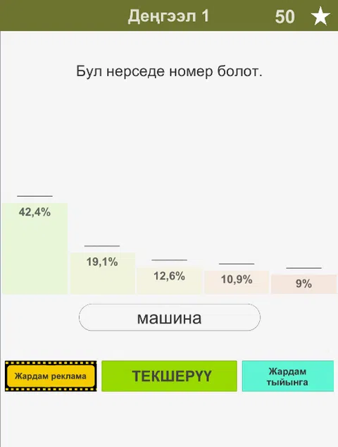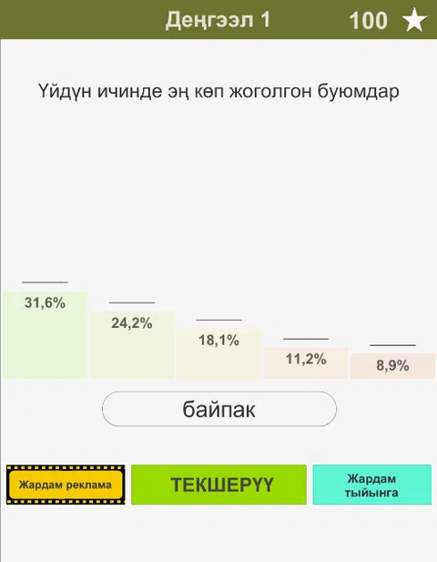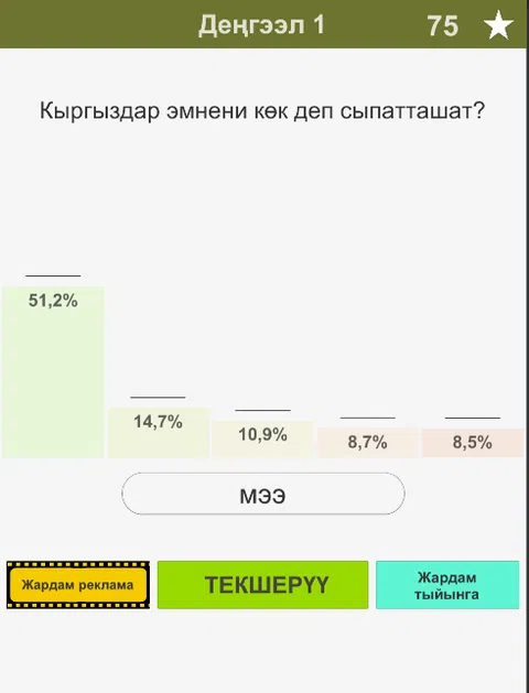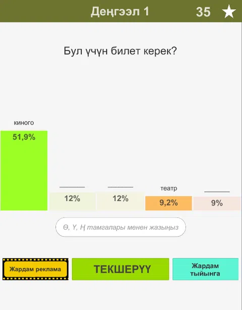 新吉尔吉斯94%游戏。 本场比赛的条件如下: 您将被问到一个问题。 对于给定的问题可能有多个答案。 但你应该能找到 94% 的答案