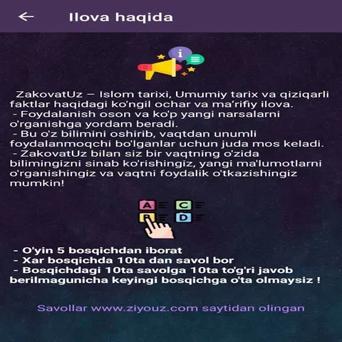 通过 ZakovatUz,您可以测试您的知识、学习新信息并同时享受美好时光。