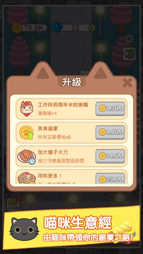在这款充满趣味与挑战的游戏中,你不仅可以体验到喧嚣的餐厅经营生活,还能与可爱的猫咪们共同为客人提供的服务。一起与这些萌萌的小帮手们打造出属于你们的梦幻餐厅吧! 游戏特色: 萌萌的猫咪厨师们:每一只猫咪都有其独特的技能和个性,你需要学会如何应对他们的特点以提升你的餐厅服务。 经营决策:从菜单选择到装潢布置,你需要做出众多决策来经营你的餐厅。你的决策将直接影响客人的喜好及餐厅的获利。 实时挑战:时刻面对新的挑战,像接待特殊的客人,完成限时任务,不断提升你的经营能力。 收集与升级:通过完成任务和获得奖励,你可以收集并升级你的猫咪厨师,让他们更地工作。 无论你是经营类游戏的爱好者,或是喜爱可爱猫咪的玩家,"猫咪当店长"都能带给你难以忘怀的游戏体验。快来下载,开启你的猫咪餐厅经营之旅吧