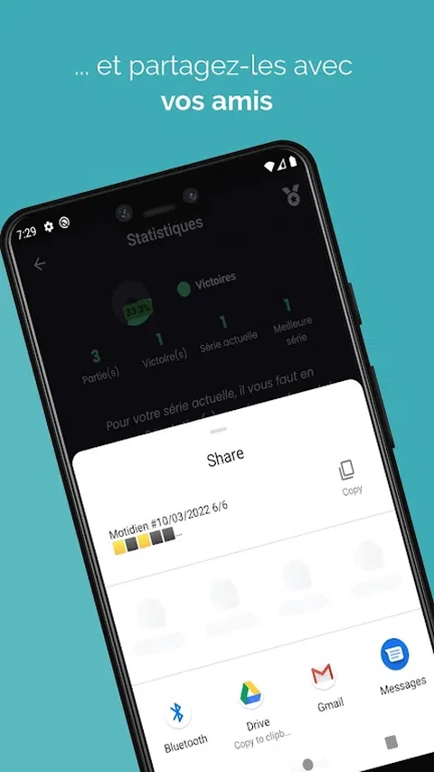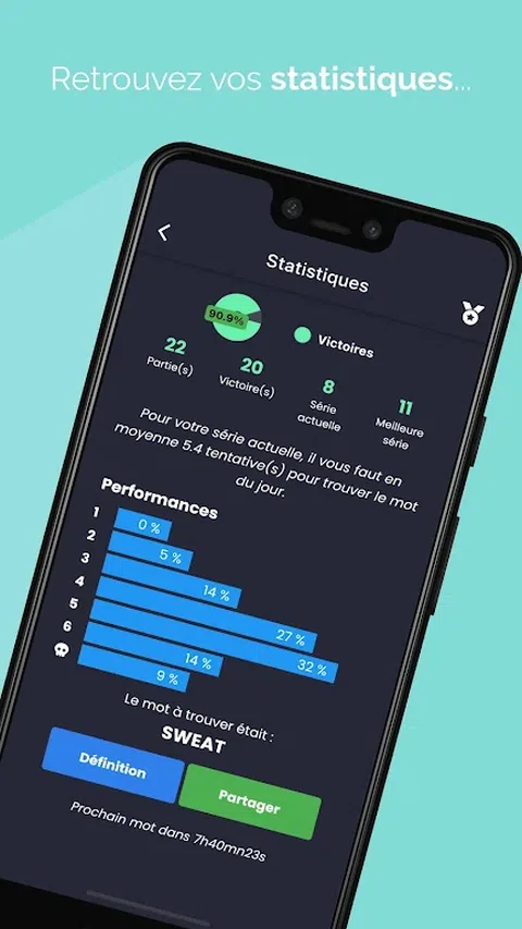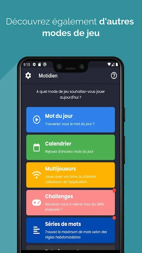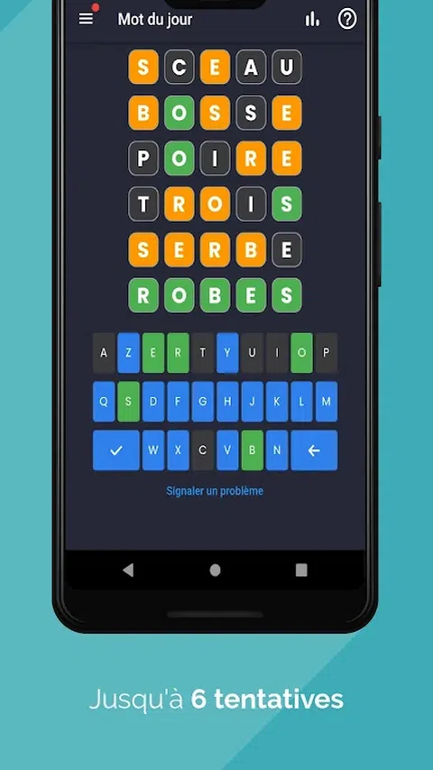 Motidien - 免费的每日单词拼图 使用免费的每日文字游戏 Motidien 锻炼您的大脑并提高您的词汇量。每天,在最多 6 次尝试中发现一个要猜测的新词。颜色线索将帮助您更接近答案: - 灰色:字母不在单词中。 - 橙色:字母在单词中但位置不当。 - 绿色:字母在单词中且位置正确。 单独玩或与朋友一起玩,并使用分享按钮分享您的结果。查看您的游戏统计数据以跟踪您的进度,并访问每日定义词。 Motidien 还提供额外的游戏模式来挑战您: - 日历:查看您的游戏历史并重播当天的旧词。 - 练习:提高你找到当天词汇的速度。 - 单词系列:使用限时单词系列测试您的词汇量。登上每周排行榜并获得奖励。 - 挑战:接受难度越来越大的挑战并解锁新关卡。 - 多人游戏:和你的朋友一起玩。 有了 Motidien,每天都能在刺激大脑和学习新单词的同时获得乐趣。为了避免在手机上花费数小时,您每天只能玩一款游戏