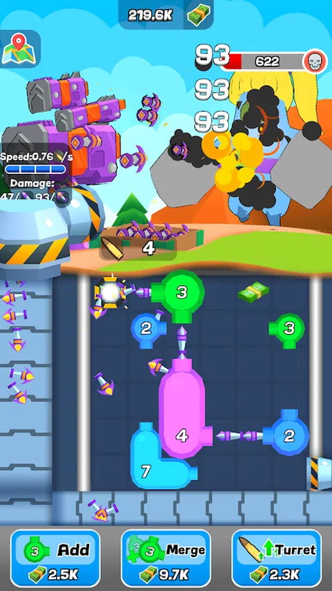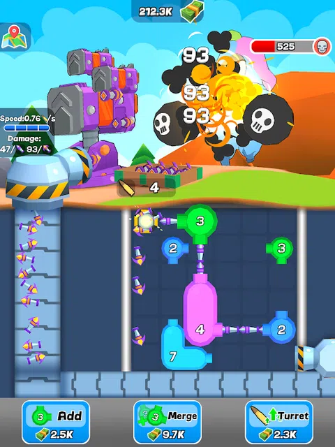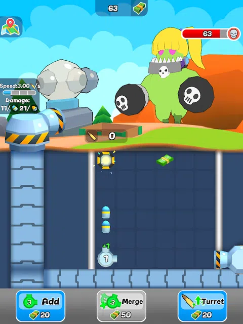 Idle Bullet Split 是一款简单但令人上瘾的休闲游戏,挑战玩家建立自己的子弹输送系统并捍卫自己的基地。游戏的屏幕右下角有一个固定炮塔,可以稳定地发射子弹。当子弹穿过相应编号的管道时,它会分裂成多个具有相同值的子弹。 玩家可以使用三个按钮来帮助他们升级系统:添加新管道,合并两个相同级别的管道以创建更高级别的管道,以及升级屏幕上半部分的炮塔。管道随机出现在 6x6 网格上,玩家可以拖动和旋转管道以创建最有效的输送系统。 管道都是直角,因此玩家必须使用策略来确保子弹进行必要的转弯。如果子弹击中墙壁或升级设备,它将落到传送带上并被传送到屏幕上半部分的炮塔。屏幕下半部分产生的子弹数等于炮塔可以发射的子弹数。 《空闲子弹拆分》是一款有趣且具有挑战性的游戏,需要策略、耐心和一点运气。凭借其简单而令人上瘾的游戏玩法,玩家会发现自己回来获得更多