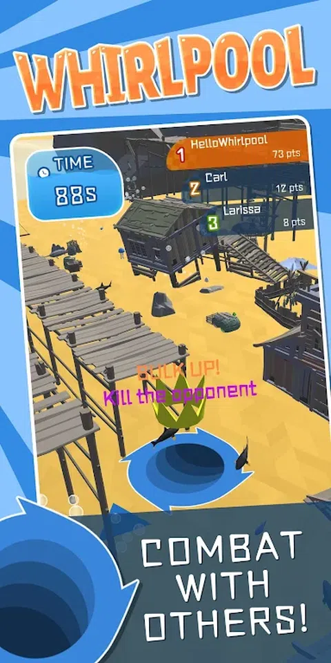 进入竞技场,在激烈的战斗中面对其他漩涡。 用您的漩涡浴缸吃掉眼前的一切,然后将其扩大以吃得更多!向他们展示谁是海上的漩涡