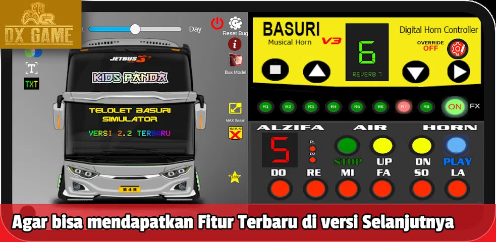 WCR Studio 的官方游戏 - DXGame Youtube 频道。印度尼西亚 Basuri Telolet Pianika 游戏的先驱。 从2.2版本直接发布,现在是2.3版本。 最新、最复杂的病毒式 telolet pianika 游戏或应用程序,适合那些喜欢 basuri alzifa 的 telolet 声音的人。配备了basuri alzifa模块(V1、V2、V3和V4),具有与bussid类似的公交车喇叭声音,即basuri alzifa和waskitaairhorn喇叭的7个空气喇叭。 这个游戏中有很多 basuri mods,即 70 个 Alzifa basuri 模块喇叭声音。这款精简版的 telolet basuri pianika 非常适合您的 bismania、卡车狂热和 Bussid 玩家一定会喜欢它,亲自尝试一下。 如何弹奏Basuri Alzifa钢琴: 1. 普通模块:是普通的标准钢琴模块。您甚至可以在学校有作业时使用它。 2. Alzifa V3 模块:选择 M1 至 M70。 M 是 Basuri Horn mod 或声音模块。 3. 使用“Level Up”按钮:提高 telolet basuri 喇叭的声音。 4. 使用Chorus:美化telelet喇叭声音。 5. 还可以使用 Echo : 进行声音重复。 最新的2.3版本有很多功能: 1. + 自定义闪光灯来装饰和美化巴士 2. + 巴士模型;游戏中有多种巴士选择,从SR2、SR3、Jet3+、SHD、Jet 2等开始。 3. + FX On/Off,因此您可以播放带或不带音效的音频 4. + BUS STUDIO 装饰你最喜欢的巴士 5. + 巴士昵称贴纸 6. + 巴士配件贴纸 7. + Waskita、Alzifa 和 Basuri 气喇叭的最大面板 8.+彩虹文本或STROBO文本/运行文本 9. + 完整 LIVERY 巴士选项的集合。共有77辆漂亮酷炫的Livery巴士。 10. + Waskita 和 Basuri V1、V2、V3、V4 气喇叭的自动播放模式 11. + 完整钢琴谱2个八度 12. + Pianika lite alzifa 安装官方游戏发行商提供的 basuri telelet pianika 游戏,并期待下一版本中的其他有趣更新。享受演奏 Pianika Telolet Basuri 的乐趣