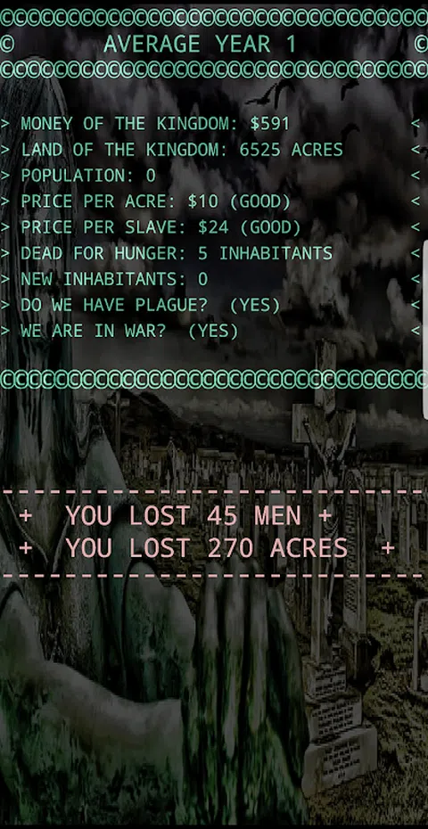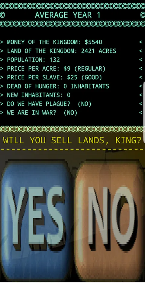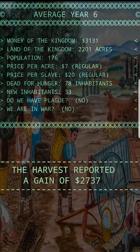 无障碍语音导览游戏。为了玩这个游戏,您必须事先暂停对讲。 你将管理一个资源匮乏的小镇。你的目标是让这个小镇变得富有,让所有居民都非常开心。为了实现你的目标,你必须统治王国 80 年,在此期间你必须拥有 20 万美元的资本。 游戏的每个阶段代表一年。在每年年初,它会通知你所拥有的资源。总金额,您拥有的以英亩为单位的土地数量,居民数量,每英亩的价格以及在战争中俘虏的奴隶的销售价格。 在回答之前你必须仔细考虑,因为你可能会损失很多钱,村民可能会饿死。 第一个问题是您将分配多少钱在镇上分配。如果你给的太少,有些人会饿死。如果你给他们太多,他们都会很高兴,更多的人会来自其他城镇。这将增加您的人口,并帮助您收获更多。 接下来,系统会询问您想种植多少英亩。这将取决于王国的货币和可用的居民。获得好收成非常重要,因为这是筹集资金的途径。如果害虫攻击您的庄稼,您将损失一些钱。 如果另一个城镇向你宣战,你将被问到将派遣多少人参加战斗。在这里你也必须非常小心,因为如果你发送的少于必要的,你将失去人员和金钱。但是,如果您获胜,您将获得战利品和一些奴隶,您可以将其出售或让他们居住在您的王国中。 如果很多人死于饥饿或战争,愤怒的人们会走上街头要你的头