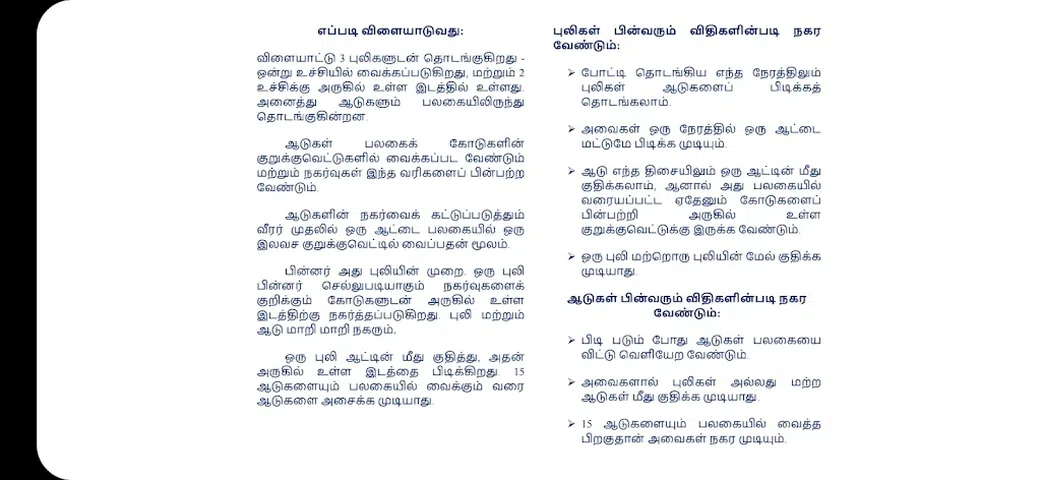 Aadupuliyattam(也称为老虎和山羊游戏)是泰米尔纳德邦的一种古老游戏。 这是一个由两个玩家玩的战略棋盘游戏。 Aadupuliattam 游戏仍在开发中。 该应用程序需要互联网