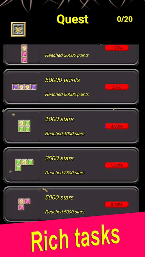 “Block Puzzle Pro 是一款经典,拥有超级有趣的块状宝石,是从普通版本升级而来的”。 《Block Puzzle Pro》玩法简单,玩起来却让人上瘾。您只需要尝试一下,您就会喜欢上它! 如何玩 BLOCK PUZZLE PRO: 1.按住鼠标键移动方块宝石。 2. 将块状宝石垂直或水平排列以得分。 3.会有很多幸运星助你得分。 4.当你获得一定数量的星星时,你将获得块状宝石的旋转奖励。 5.每天登录后,都可以选择是否删除宝箱。 6.保存状态,随时可以继续玩。 7.完成内任务开启新方块。 中的功能: 1.经典界面超级酷炫漂亮。 2.中的一切都是免费的。 3. 非常简单但令人上瘾的,适合所有年龄段。 4.中任务多样丰富