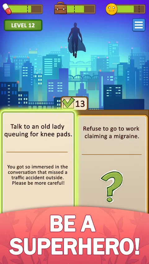 玩超级有趣的生活模拟游戏,在其中每个级别都可以玩新生活!尝试自己成为公主、超级英雄、海盗甚至圣诞老人!密切注意进度条。所有这些都必须在关卡结束时填满! 你能从第一次尝试解锁新角色时就做出所有正确的选择吗?这并不像看起来那么容易。关卡非常棘手!探索您将进步多远,以确定您在生活模拟中的成功。该游戏与普通的互动故事游戏没有任何共同之处。它会让你真正思考! 立即开始在最令人兴奋的生活模拟器游戏中扮演新角色