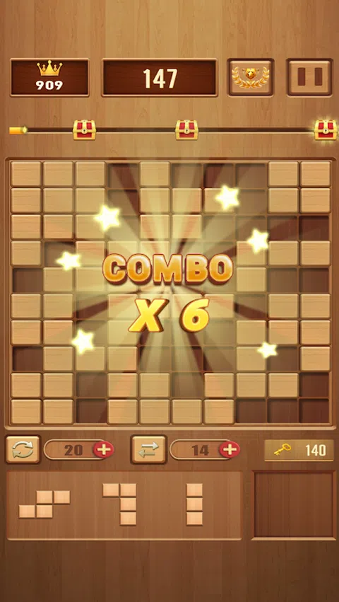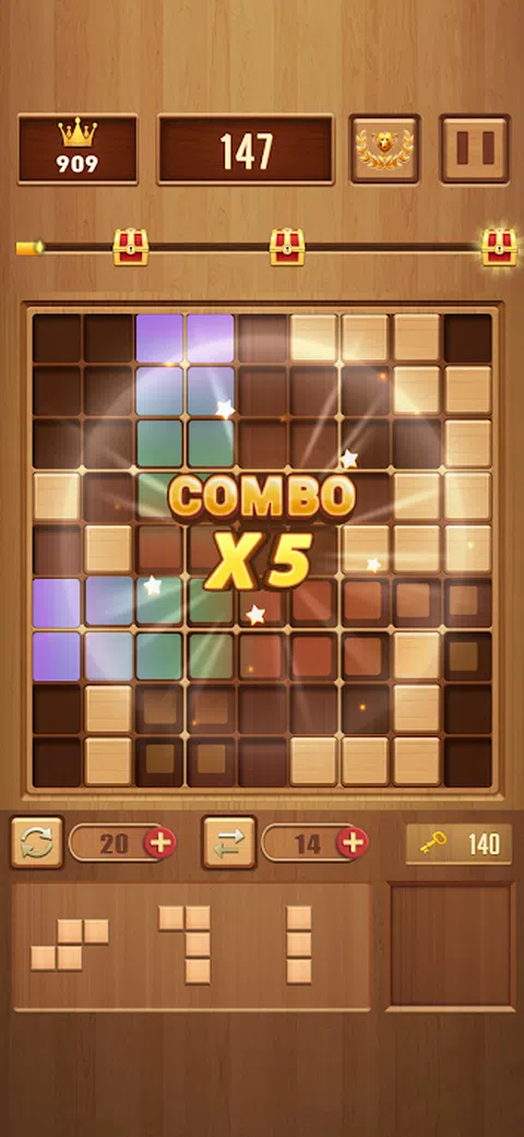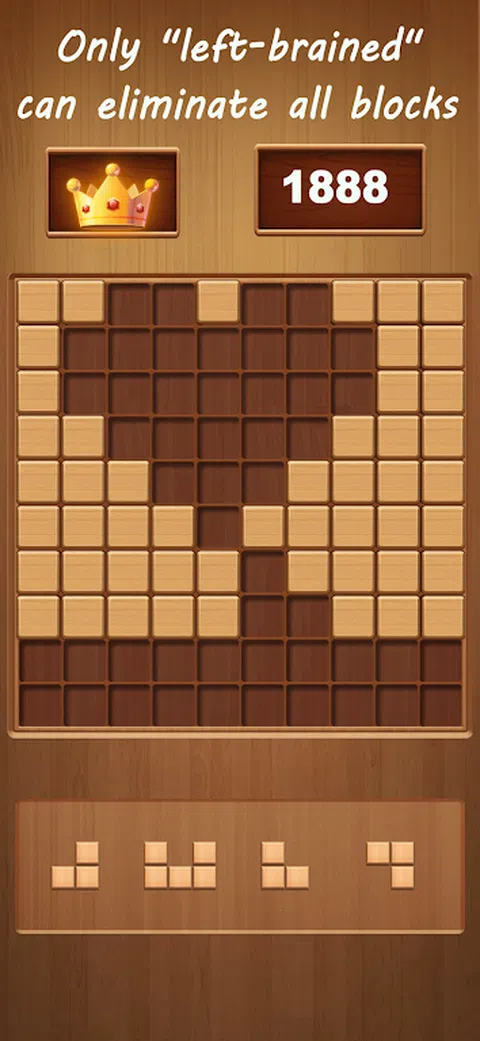 游戏简单有趣,是休闲放松的选择。 - 拖动 3 块木块并将它们放在棋盘上。当一行或一列被填满时,整行或整列的木块将被。 - 尝试同时多行或多列。的行或列越多,获得的分数就越高。当没有地方可以放置方块时,游戏就结束了。 - 方块一旦放置在棋盘上就无法移动。如何合理放置方块并获得最高分需要你保持聪明的头脑和清晰的思维。 游戏没有时间限制,可以先思考再开始行动