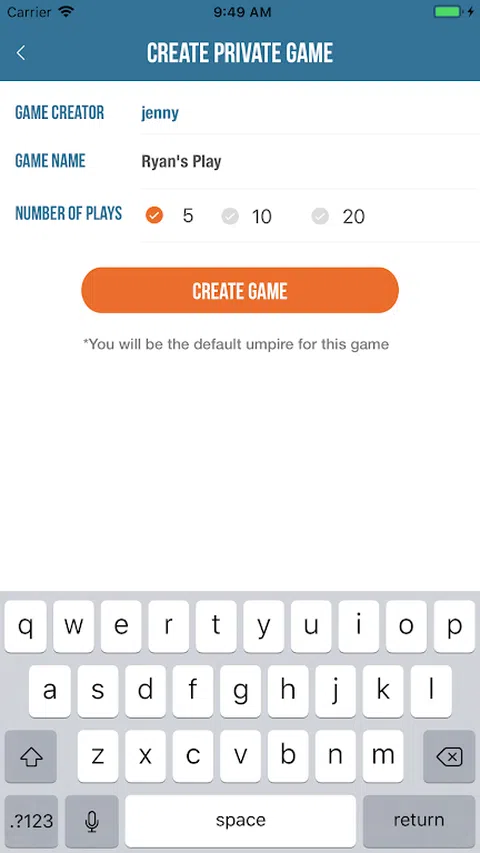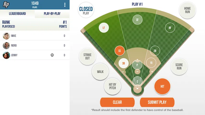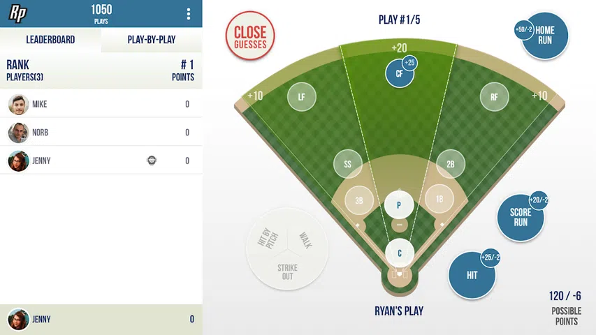 您是否曾经发现自己在观看棒球比赛并认为自己知道接下来会发生什么!?那么,通过 Ryan 的“玩棒球”,您可以猜测下一场比赛并与您的朋友一起赢得积分! 游戏玩法很简单。您所要做的就是选择您认为球接下来会去的地方。您可以猜测场上的九个位置之一,或者保送/三振/投球选项。 如果您认为击球手会上垒,您可以选择“击球”。 如果您认为跑垒会得分或击球手会击出本垒打,您可以选择“得分跑”或“本垒打”。 如果您创建了游戏,那么您就是默认的裁判员,这意味着您负责在第一个投球投给击球手之前结束猜测期,然后输入比赛结果。比赛结果应包括击球后第一个控制球的守场员,而不是第一个触球的守场员。 裁判员也是他们所创造的比赛的参与者,因此请确保输入的结果公平且准确。 *正在申请专利* Ryan 的所有 Play Sports 应用程序(包括 RP Baseball)均正在申请专利。 即将推出:RP 板球、RP 篮球、RP 足球、RP 足球等