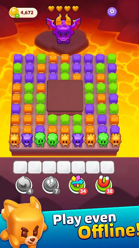 在此块匹配益智游戏中,增强您的大脑。没有被困以解开它们的水龙头块。匹配3种颜色以清除它们。不要让托盘用光空间。 需要点击游戏桌面中三个同色角色,让他们走到下方物品栏格子里进行消除,难度会随着关卡增加。
