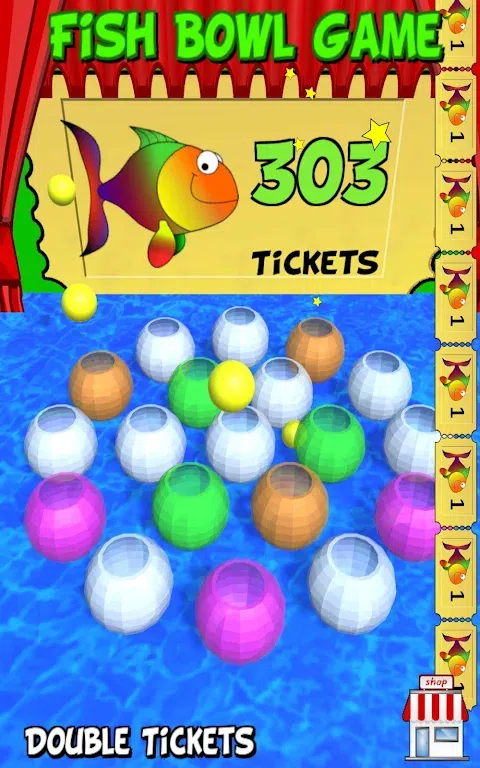 嘉年华鱼缸游戏 我们喜欢嘉年华游戏,这是另一个家庭最喜欢的游戏,它是鱼缸游戏。 将你的乒乓球扔到鱼缸里,如果你的乒乓球留在鱼缸里,那么你就赢了。 与所有侧面失速游戏一样,它看起来比实际上更容易。 涉及真正的技巧,向上轻弹以扔乒乓球。轻弹速度和位置都有影响。这是一个技巧游戏,也许还有一点运气。 大量的笑声,大量的乐趣,如果你能做到,还有成捆的门票。 沿途购买特价商品以赢取更多门票,然后一起去小隔间见先生,并用您的门票换取奖品。 这个游戏没有任何可疑之处,现在就下载鱼缸游戏,这是我们游乐场系列中的另一个超棒的嘉年华游戏