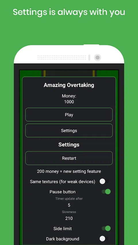 我创建了一个具有许多设置的游戏,但不会立即出现。 也就是说,你玩得越多,就越有趣,因为你可以根据自己的喜好来设置。 何为惊人超车? 因为,这款游戏有着令人惊叹的游戏玩法。 你可以无休止地超越其他汽车,并且游戏有可能通过玩它来获得新的设置功能。 为什么要付费完整版游戏? 因为,购买它,你就支持了开发者并给予了更新游戏的动力。 我可以免费玩吗? 是的,因为这是名为“Amazing Overtake Lite”的游戏的免费版本 我看不到所有设置。为什么? 因为,游戏中每有200个虚拟货币后,就会增加一个设定。 如果我的智能手机上的游戏延迟怎么办? 启用相同纹理,此功能立即出现