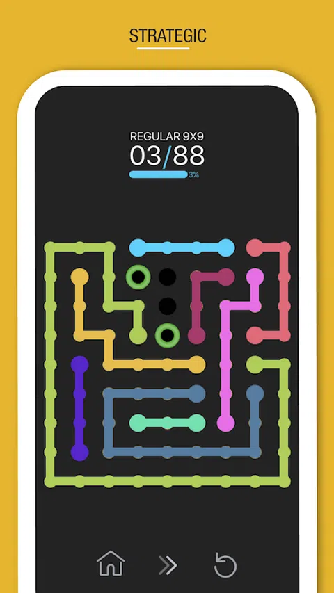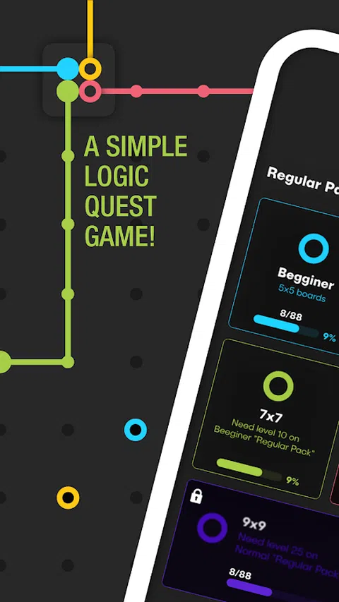 88 自由- 连接点融合了颜色拼图,点连接和颜色匹配游戏的最佳功能,为您带来终极的线型数学难题!使用带有3种不同游戏模式和每种模式5种难度的颜色连接颜色拼图游戏,测试您的大脑敏锐度,战略性和解决问题的能力! 一个简单的逻辑探索 这款令人上瘾的线条益智游戏只需要你做一件事:用相同颜色的线条将颜色点连接起来。在不遮挡其他管道颜色的情况下创建点连接颜色并以最快的速度完成。 3种超好玩的游戏模式 与其他简单的管道连接点游戏不同,88 自由- 连接点在关卡和游戏模式下都给了你大量的选择。通过玩来享受解决不同谜题的乐趣: 常规关卡 5种游戏模式 这款经典的色点挑战将整个网格点缀在一起,挑战有5个不同的困难:-新手拼图 -简单拼图 -普通拼图 -8x8 -狂热 不常规关卡 5种游戏模式 经典模式的一种更难的扭曲,即并非网格中的所有位置都具有连接点。在以下模式中适用: -新手拼图 -简单拼图 - 7x7 - 8x8 - 9x9 间隔关卡 (有时间限制) 经典游戏模式,有时间限制,有5个困难: -新手拼图 -简单拼图 - 7x7 - 8x8 - 9x9 因此,如果您已经准备好迎接一个新的精巧的连接点的逻辑挑战, 那么88 自由- 连接点正好适合您