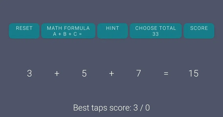 这个游戏在屏幕顶部显示添加! 第1步:选择数字 第2步:选择数学公式 例如:a + b + c = 3 + 5 + 7 = 15 第3步:点击3、5、7使其翻倍! 第4步:尝试: 数学公式=所选数字 最佳得分点击=您的得分 不要超越最高分