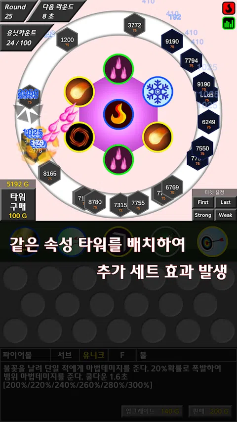 这是一个随机的塔防游戏,它通过放置各种效果的塔来攻击敌人。每个塔具有不同的类型,等级和属性,并且通过拖动和组合同一塔来创建更高等级的塔。 ◆塔式 -中心:它是放置在中心的塔,并且是处理主体的塔。 -Serve:它是围绕中心塔放置的塔,并且它是使用交易和异常状态攻击的塔。 -被动:强化或强化敌方的塔。 -主动:使用时,此塔会激活指定的能力。 ◆塔层 如果您组合同一塔,则会创建更高层的随机塔。 ◆塔楼升级 您可以使用黄金来增强塔的效果。 ◆塔楼属性 如果将所有具有相同属性的塔放置,则将获得其他塔设置效果。 ◆损坏 -物理伤害:在受到敌人防御的影响后施加。 -魔法伤害:原样使用,不受防御影响。 ◆游戏模式 -经典模式:每回合都会创建敌人,如果敌人数量超过一定数量, 打败。杀死所有敌人,直到最后一轮。 ◆更新 六边形随机防御处于beta开发阶段,许多因素可能会经常变化