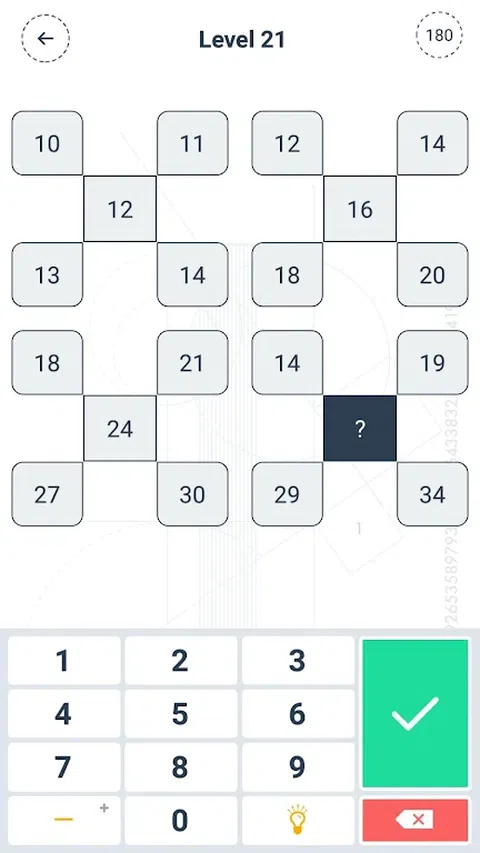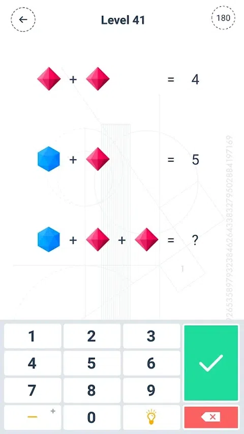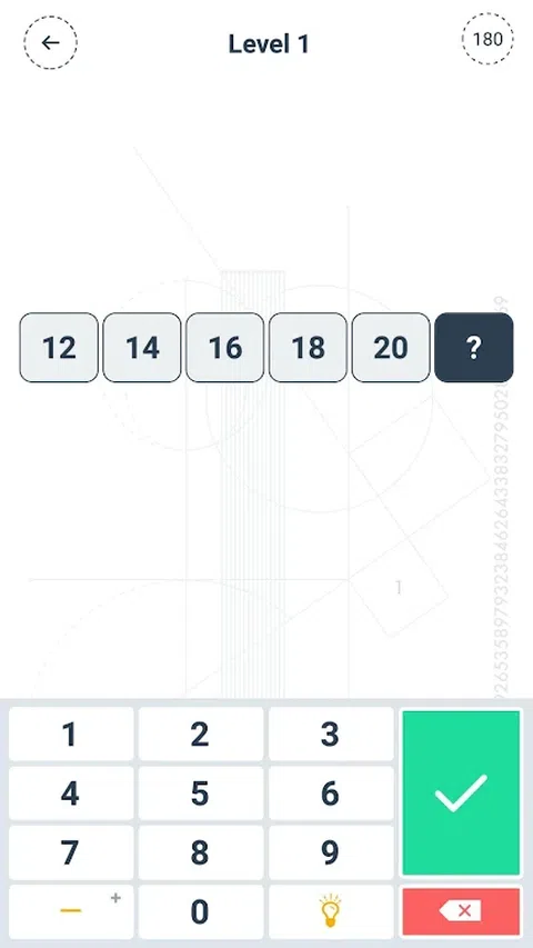 MATHEA是一款适合所有学生和成年人的具有教育性和趣味性的数学游戏。 你准备好迎接5个类别100个问题的旅程了吗? 您可以通过解决数字和形状之间的逻辑来找到答案。 每次游戏都会刷新数字,让您在每个级别保持活力。 如何玩? 不同类别的部分根据一定的逻辑列出数字。通过解决数字与和声之间的联系,我们很难知道问号表示的数字。当关卡开始播放时,180秒计时器将启动。如果在计时器结束之前无法给出正确答案,则该部分无法完成。如果您答错3次,您将有两个选择:您可以切换到不同的部分,或使用不同的数字和逻辑重新玩游戏。请务必注意,当您想重玩每个级别时,数字和逻辑会发生变化。这样你就可以挑战自己 是否需要付费? MATHEA是完全免费的。 它包括供我们开发新游戏和添加关卡的广告