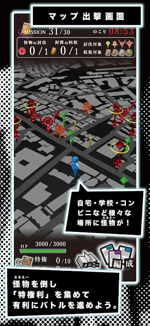 Taigayaku urSTORY 是一款基于漫画应用程序“GANMA!”中发布的流行作品“Taigayaki”(原作:宫川大河)的位置信息游戏。 * 许多失踪的 urSTORY 是一款活动游戏,将在 2021 年 2 月 28 日之前限时分发。 充分利用你的特殊权利,从突然出现的“皇帝”那里夺取任务,并获得皇帝的真实身份。你是任务的参与者,舞台就是你的城市。 ◯ 让我们在城市中漫步并收集“特权” 通过在城市中实际走动,找到敌人并在战斗中击败他们,您可以获得“特权信封”!以最强阵型挑战战斗吧! ◯ 查明皇帝的真实身份 突然来了一个自称“皇帝”的人的消息。收集线索,找出“皇帝”是谁! ◯让我们捕捉每天呈现的任务 按照“皇帝”提出的任务,在限定时间内击败指定数量的敌人,收集特殊权利。每天将呈现一个任务,总共 30 天。