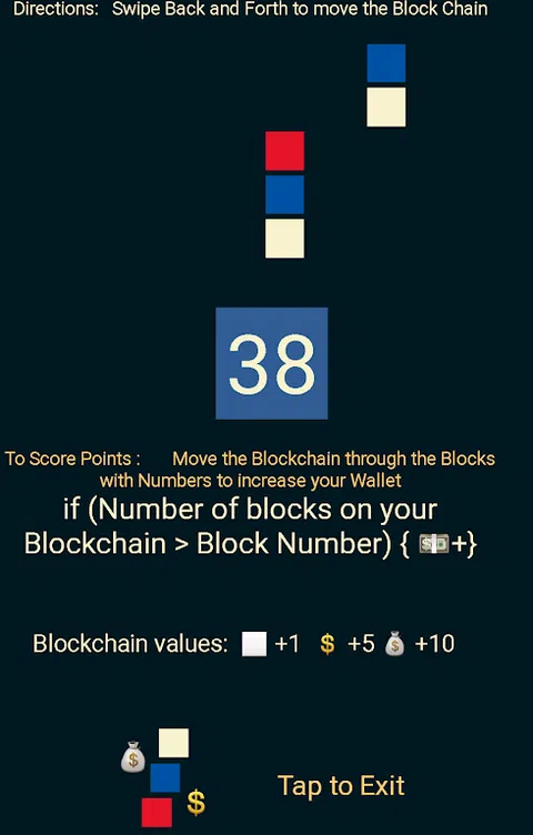 区块链钱包游戏 来回滑动以移动并收集更多块以添加到区块链 表情符号美元和表情符号钱袋用于 +5 和 +10 块 这只是一场获得最高分的游戏