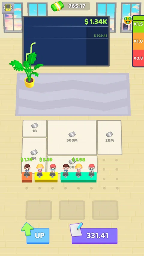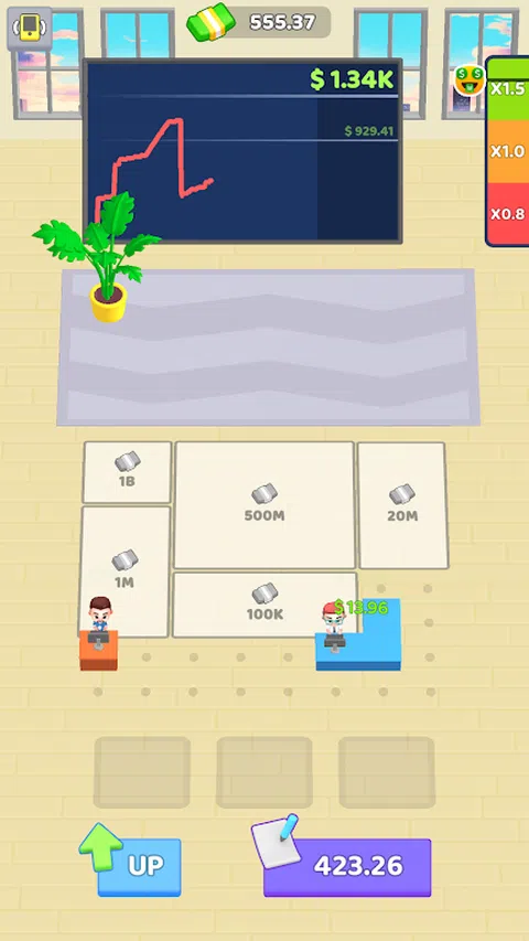 管理股票交易员办公室。雇用新员工,将他们合并以获得更高级别的员工