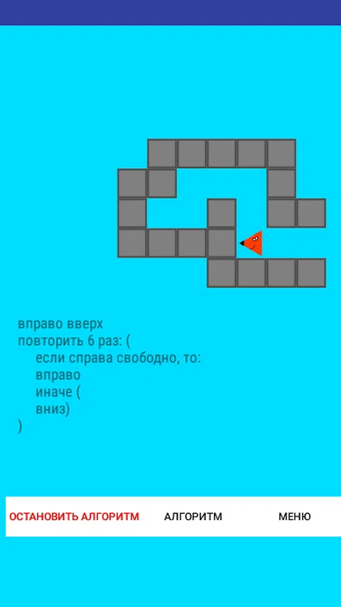 主角:狐狸。在这个游戏中,你需要为狐狸编写一个算法(就像在计算机科学课中一样),根据这个算法,狐狸必须吃掉所有的 koloboks 并退出迷宫。该算法完全用俄语编写。前五个关卡,狐狸只能找到出路,从第6关开始,它还必须吃koloboks。您可以在游戏本身中阅读详细的教程。 此版本的游戏是免费的,但与完全付费版本相比存在许多限制。付费版和免费版的区别也在游戏内教程中有所描述。免费版可以说是为了“尝试”这个游戏的版本