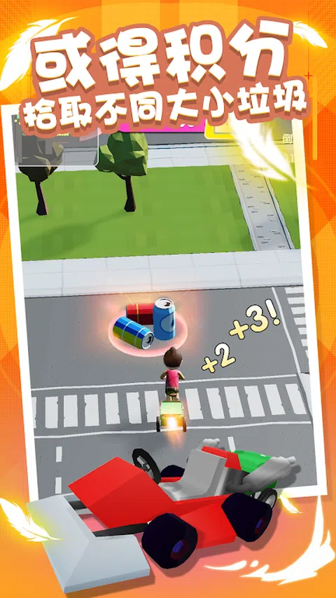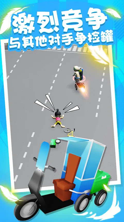 拾取不同大小的垃圾,得到不同的点数 与其他竞争者竞争捡起罐头。谨防恶意竞争 开着垃圾车在城市里捡垃圾桶。 按住屏幕使垃圾车滑动,松开屏幕向前冲刺。 合成升级更多的垃圾车,额外的车可以租到钱