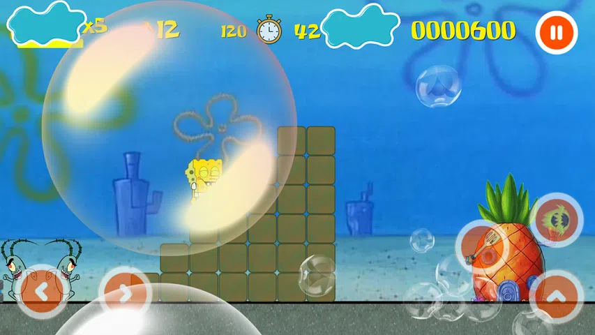 超级海绵冒险,用于移动鲍勃,在控制面板上向右或向左单击!按跳跃按钮进行超级海绵跳跃冒险 吃完汉堡和硬币后,您可以选择新玩家帕特里克怪物。 在挑战关卡中滑动和跳跃 生活在一个新的世界海绵中