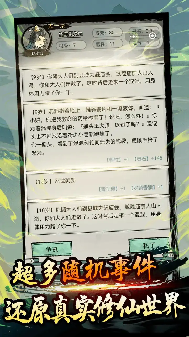 是不是受够了那些挂着羊头卖狗肉氛围感缺失的修仙游戏,是不是想体验更加真实、开放的修仙世界,那么,或者可以试试咱们家这款游戏,普通又不普通的修仙模拟器! 随机选择的重生模拟器?不! 你的参与很重要,你的能力很重要,你的锻炼更重要。 这是个修仙世界+人生重开+秘境探索+战斗养成+不同故事的多元游戏。 重生就是重开?不。前世的因,今世的果,才是本作的精髓! 欲仙?欲死! 【游戏特色】 1.养成系统 人物有寿元、境界、灵气、天赋、传承、宗门、根骨、悟性、运气、家世等属性,其中后四项在每一生开始时可以选择。 寿元,就是此生的寿命,随境界可获得提升。 境界:修仙养成的阶段, 灵气:持续修炼,持续聚积,决定当前境界的层次,也决定是否可以突破境界。 天赋:出生时可以选择几种天赋,除了额外增加属性外,还可能触发隐藏的剧情。 传承:人生路上,在剧情和副本中有机会获得,并做为下一世的天赋在出生时选择,同时影响下一世的人生之路。 宗门:修仙的路上,是有机会加入不同的宗门的。不同宗门的养成之路、故事情节完全不同。当然,散修之路更有挑战。 根骨:影响修炼速度,对气血、防御有加成。 悟性:影响突破境界的成功率,对攻击有加成。 运气:影响好坏事件的发生概率。 家世:乞丐、贫民、中产、富裕、世家等。除了影响不同的人生轨迹,也会影响家族带来的好处。 除了多种属性外,功法、丹药、法宝、稀奇古怪的道具,都是必不可少的。 2.剧情系统 我们为不同运气、家世、天赋、传承、宗门的人生各设计了多种主线剧情,而且不同的机遇、不同的选择,也会带来不同的人生经历。 这些剧情不是各种重开模拟器那种纯随机事件,那种纯随机事件带来的割裂感已经渐渐不为大家接受了。 我们的剧情有铺垫,有来龙去脉,有不同选择之后的不同后续。 我们的剧情有主角的恩怨情仇,有旅途上的各种奇遇,有宗门间的竞争合作,也有配角那不扁平的故事。 我们的剧情结合了战斗、练功、双修、苦行等多种元素,让这个每一次人生都变化万千、精彩纷呈。 我们还独立设计的副本,副本可不只是打怪练级,还需要解谜、探索、寻找稀有奇遇、寻找终极传承。
