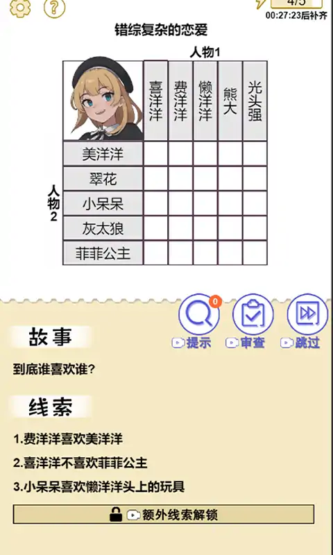 《火演惊睛》这是一款益智解谜类型的游戏,根据线索侦破推理出正确的答案。玩家通过故事、线索中的提示在对应的方块中填入对、错两种信息,全部填对则通关成功。 这是一个特别烧脑,越玩越想玩的游戏。每玩过一关就想知道下一关是一个什么样的故事,是一个什么逻辑推理的题,想要挑战更想要突破。