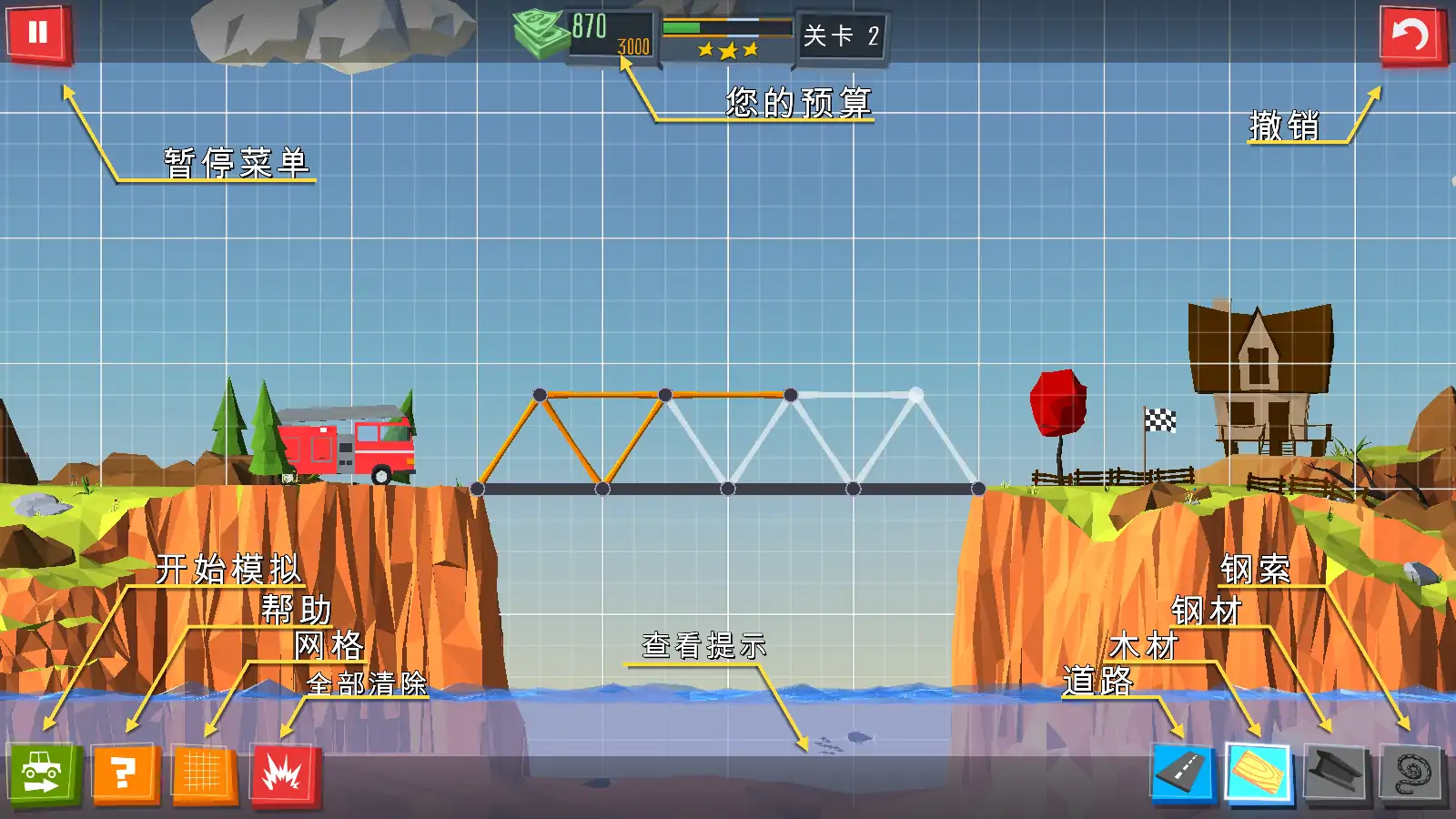 玩家必须在山谷,运河或河流上架起桥梁。建成的桥梁必须通过压力测试,以查看它们是否能够支撑经过的汽车或卡车的重量。游戏特色:-易于控制-改进的直接材料应力指示器用户界面。-测试组装的桥梁拥有各种汽车。-简单明亮的图形和令人放松的背景音乐。-在不同环境中有许多令人上瘾的关卡。精英桥梁建造者可以凭借其技能和经验经历不同的阶段。这是一个为所有年龄段的人设计的超现实的桥梁施工模拟游戏。完成桥梁建设后,您将可以在美丽的桥梁上行驶。