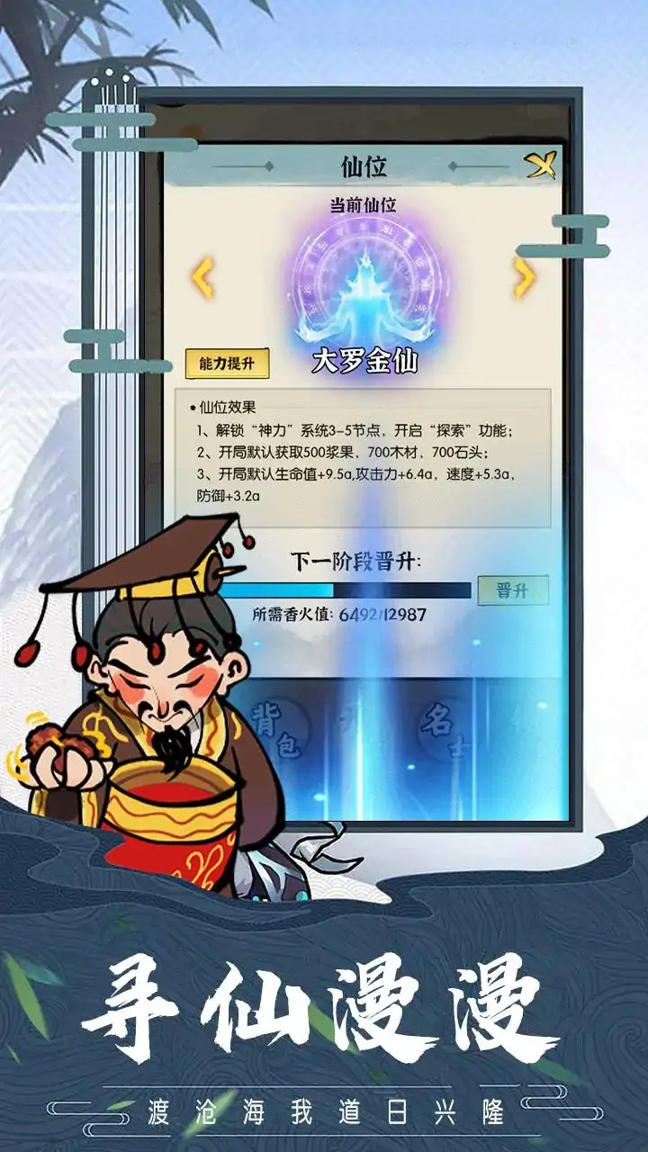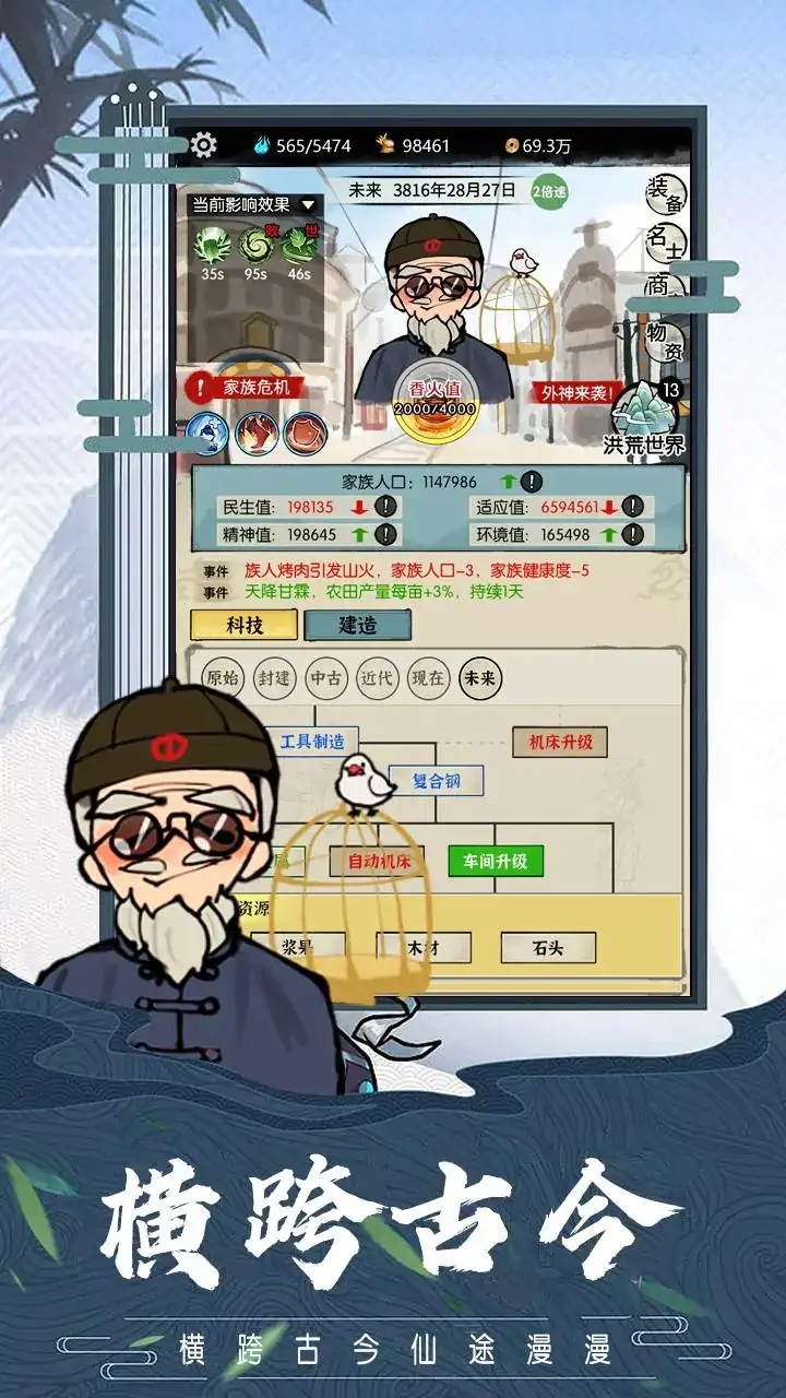 迈步穿梭古今岁月长河,一步一步构建子孙无限未来。 你将扮演先民们的祖宗之神,通过步步经营,与族人们历经原始到未来的各个时代,共同感受人类发展长河中的每一个瞬间。 事先感谢各位玩家爸爸们的关注,这款《回到史前当老祖》是我们初创小团队的第一款作品,也是我们集合了众多的想法和意见,所制作出来的一个玩法另类的“圆梦”作品。基于制作成本有限,我们决定把精力放在游戏可玩性上,多用文字与多功能的结合的手段来提升游玩的乐趣,因此在画面表现上会比较精简,还望各位玩家爸爸多多包涵。 在《回到史前当老祖》中,你将能体验到: 1、从原始人认知物品开始,再到发展出对应的文明成果,你的族人们将依照你的指示,逐步构造出独一无二的奇妙未来。 2、以一整个家族的所需为基准,满足族人们的各方面诉求。至于怎么满足?肚子饿了是吃野草还是吃面包?全取决于你的一念之间! 3、一个家族的发展壮大,并不会是一帆风顺的,也会经历各种各样的困难。结合族人们的职业特性,获取相应的技能和词条,用肉鸽的乐趣为你的家族构建出一套适合的发展体系。 4、能力越大,责任越大。你作为祖宗之神,其实力也得更加强劲。吸取香火,修得仙位,为游戏拓展更多内容,使家族发展愈加壮大!